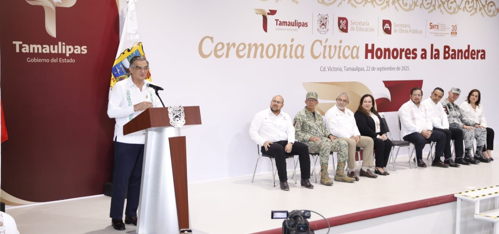 En la ceremonia cívica de honores, ante más de 400 alumnas, agregó que en Tamaulipas la transformación comienza en la escuela, “y a ustedes les corresponde garantizarlo”, afirmó.