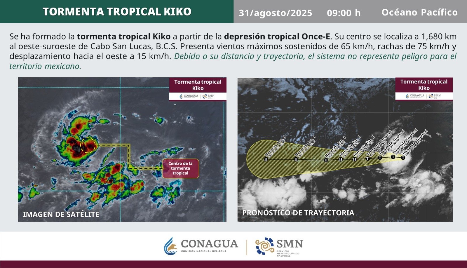 Este domingo se formó en el océano Pacífico la tormenta tropical ‘Kiko’, evolución de la depresión tropical Once-E. El Servicio Meteorológico Nacional (SMN) informó que a las 9:00 horas el fenómeno se localizaba a mil 680 kilómetros al oeste-suroeste de Cabo San Lucas, Baja California Sur, con vientos sostenidos de 75 km/h y un desplazamiento hacia el oeste a 15 km/h.