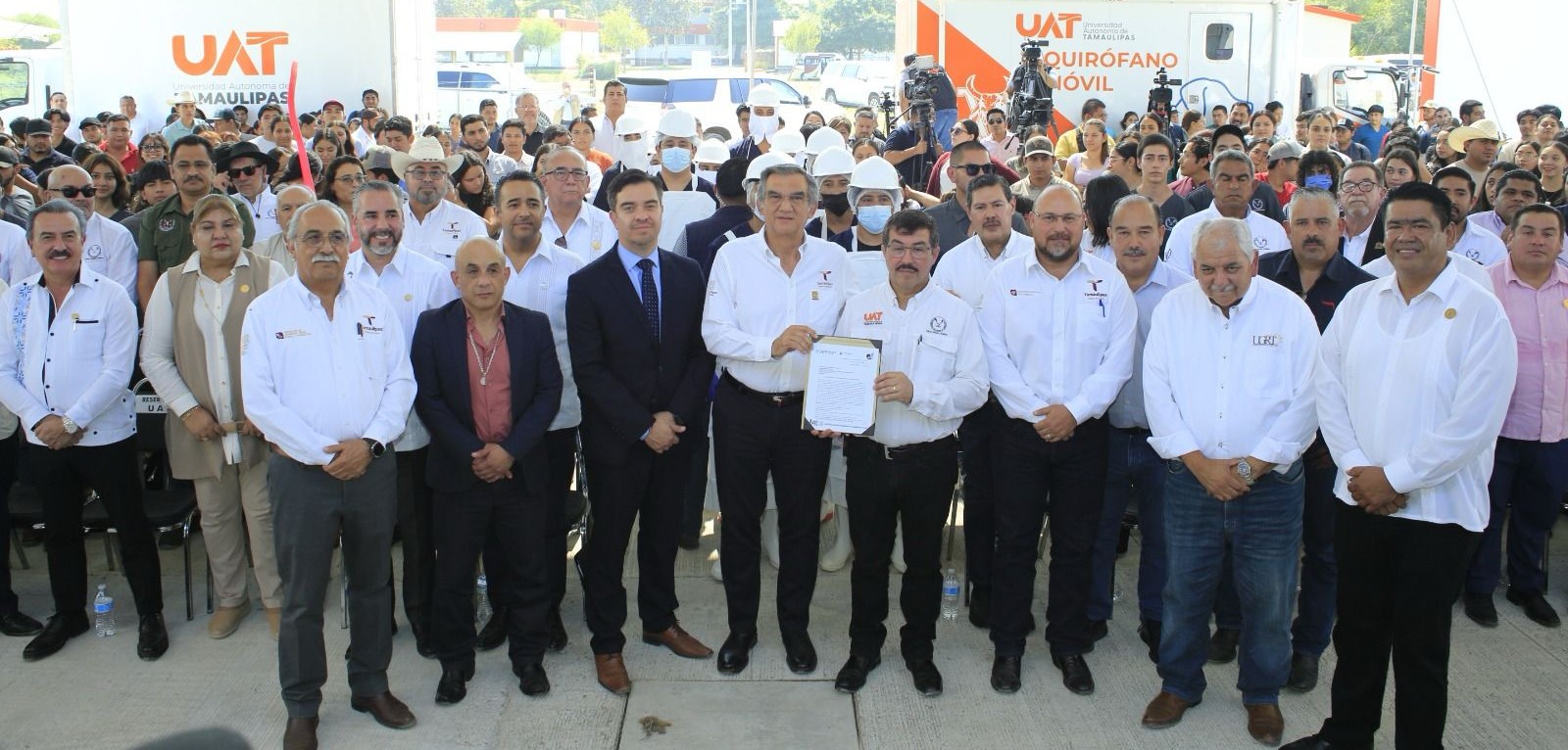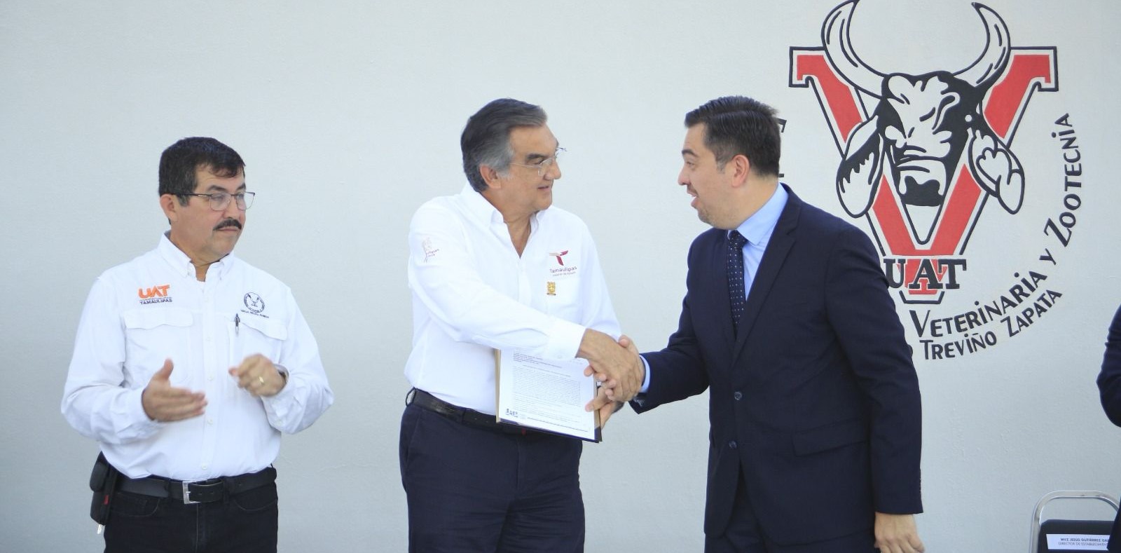 Acompañado por el rector de la UAT, Dámaso Anaya Alvarado, y dirigentes del sector ganadero del estado, el gobernador recibió de manos de Leandro David Soriano García, director general de Inocuidad Agroalimentaria, Acuícola y Pesquera del Senasica, el documento que permite la actividad diaria de la sala de corte y deshuese para la especie bovina, cámara de producto terminado, almacén, empaque y andenes de carga y descarga en el rastro ubicado en la Facultad de Medicina Veterinaria y Zootecnia, en esta capital.