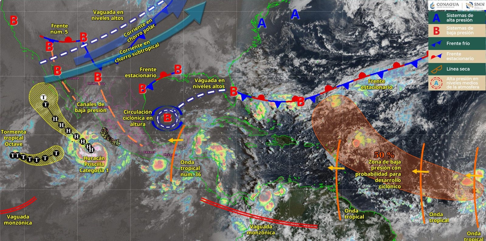 Ciudad Victoria, Tamaulipas (6 de octubre de 2025).- Este día, el huracán Priscilla se localiza al suroeste de Jalisco y al sur de la Península de Baja California, sus desprendimientos nubosos ocasionarán lluvias puntuales intensas en Jalisco (sur), Colima, Michoacán (este y costa) y Guerrero (suroeste y costa); puntuales muy fuertes en Nayarit y Sinaloa (sur); así como lluvias puntuales fuertes en el sur de Baja California Sur, informó el Servicio Meteorológico Nacional.