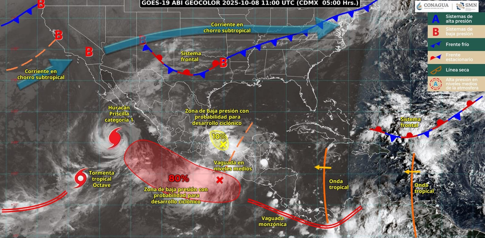 Ciudad Victoria, Tamaulipas (8 de octubre de 2025).- Para hoy el huracán Priscilla se desplazará frente a la costa oeste de Baja California Sur.