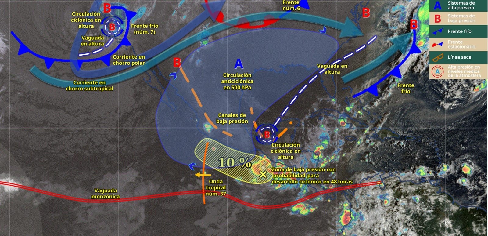 Simultáneamente, la onda tropical número 37 se desplazará al sur de las costas de Jalisco y Colima, reforzando la probabilidad de lluvias en el occidente del territorio nacional.
