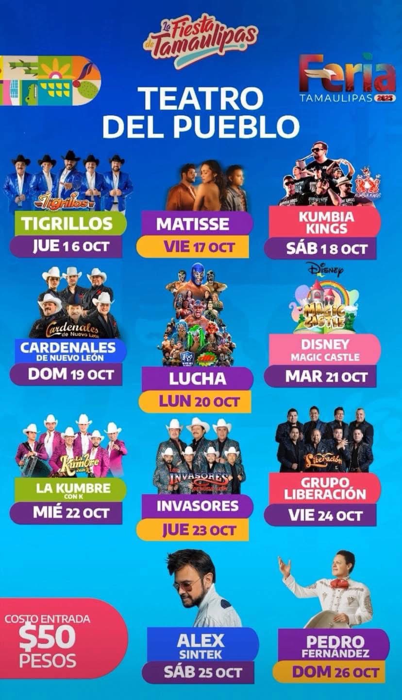 El grupo musical que abre la cartelera es el popular Tigrillos del género cumbia norteña y regional mexicano entre cuyo repertorio figuran Que Linda es Lupe, El Tiki-tá, No, no, no, , Mueve tu Cintura, Báilame, El Gallito Copetón, Mira Oye y Vampiresa entre otras.