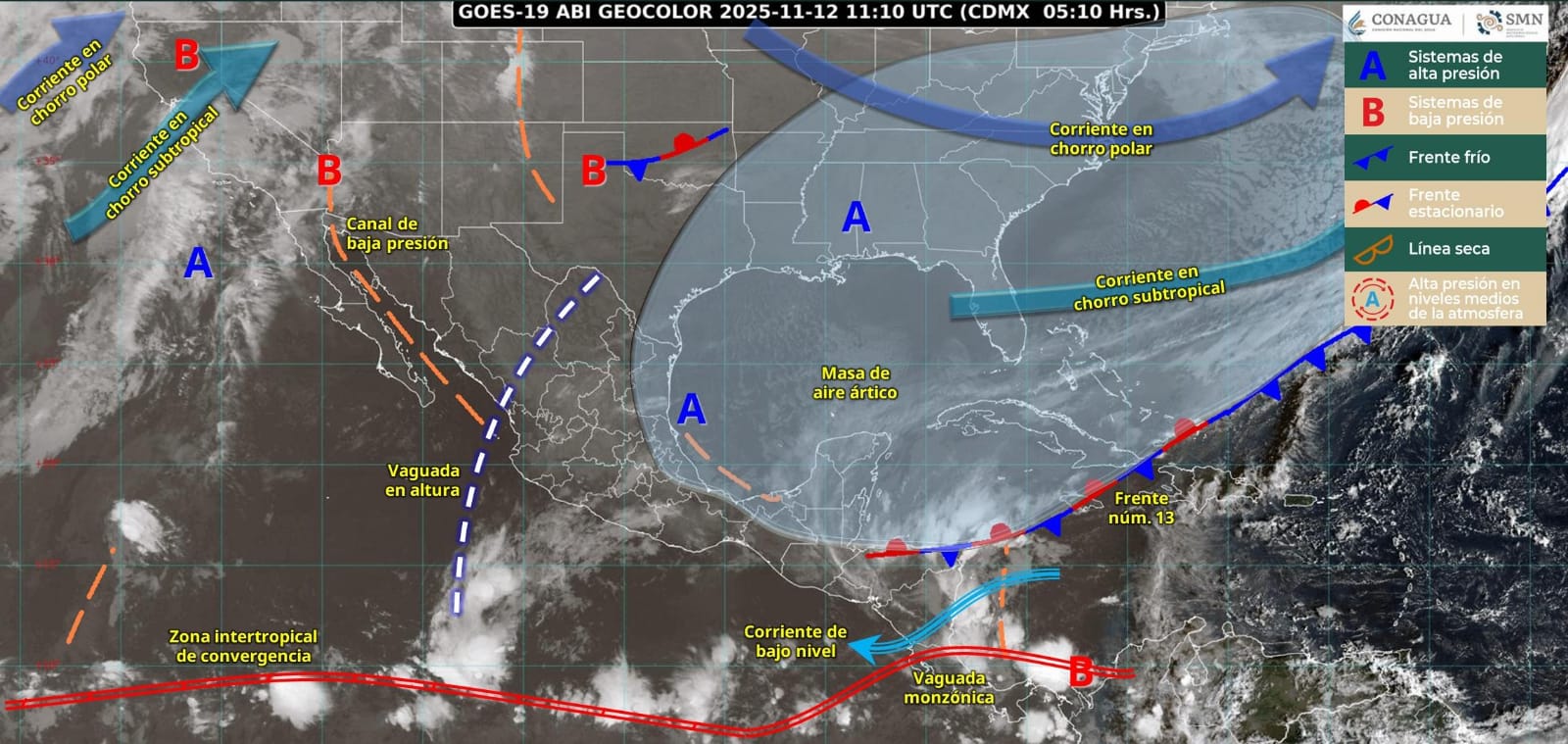 El Servicio Meteorológico Nacional informó que este día, la masa de aire ártico que acompañó al frente número 13 modificará sus características térmicas, permitiendo un gradual ascenso de las temperaturas diurnas sobre entidades del norte, noreste, oriente y centro del país.