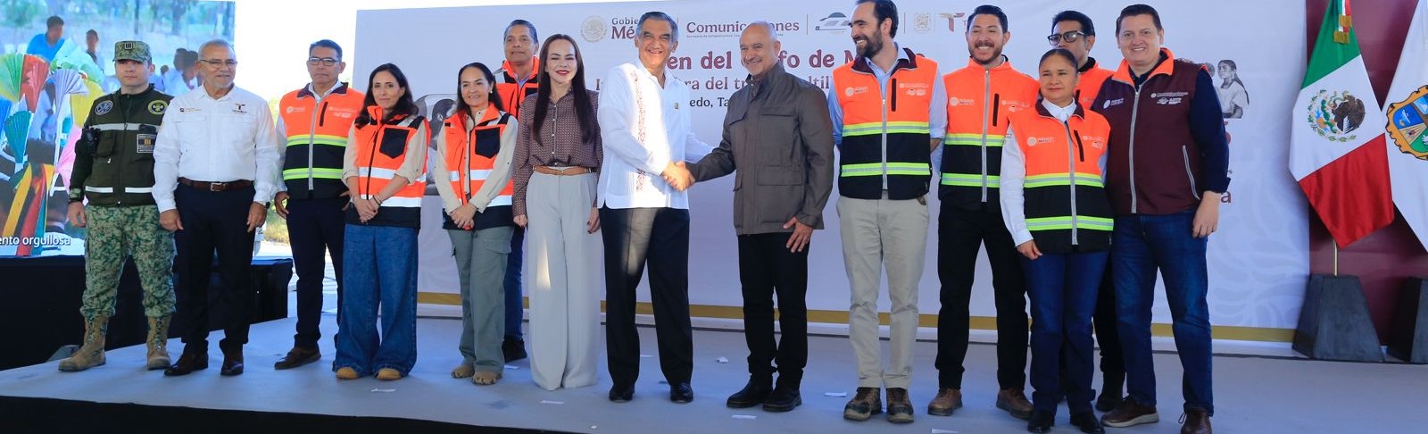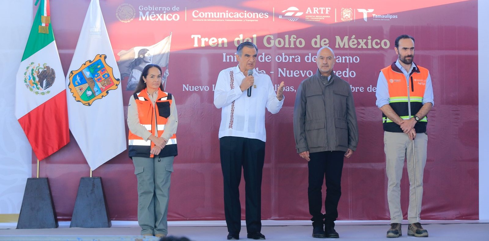 Acompañado por Jesús Antonio Esteva Medina, secretario de Infraestructura, Comunicaciones y Transportes, y Andrés Lajous Loaeza, titular de la Agencia Reguladora del Transporte Ferroviario, el mandatario tamaulipeco dio la bienvenida a esta obra de gran calado, que permitirá la generación de 10 mil 922 empleos directos y 32 mil 766 empleos indirectos.