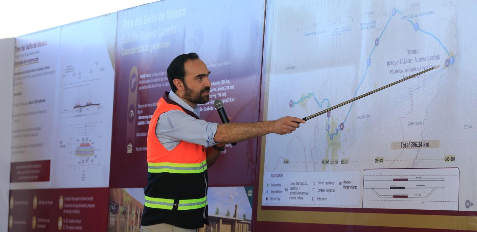 Durante el evento, Andrés Lajous detalló que el tramo Arroyo El Sauz-Nuevo Laredo del tren Golfo de México tiene 136.48 kilómetros de vía sencilla, contará con 52 puentes ferroviarios, 42 pasos vehiculares y 108 obras de drenaje, y tendrá tiempos de recorrido hacia Nuevo Laredo de menos de dos horas desde Monterrey y de tres horas y media desde Saltillo.