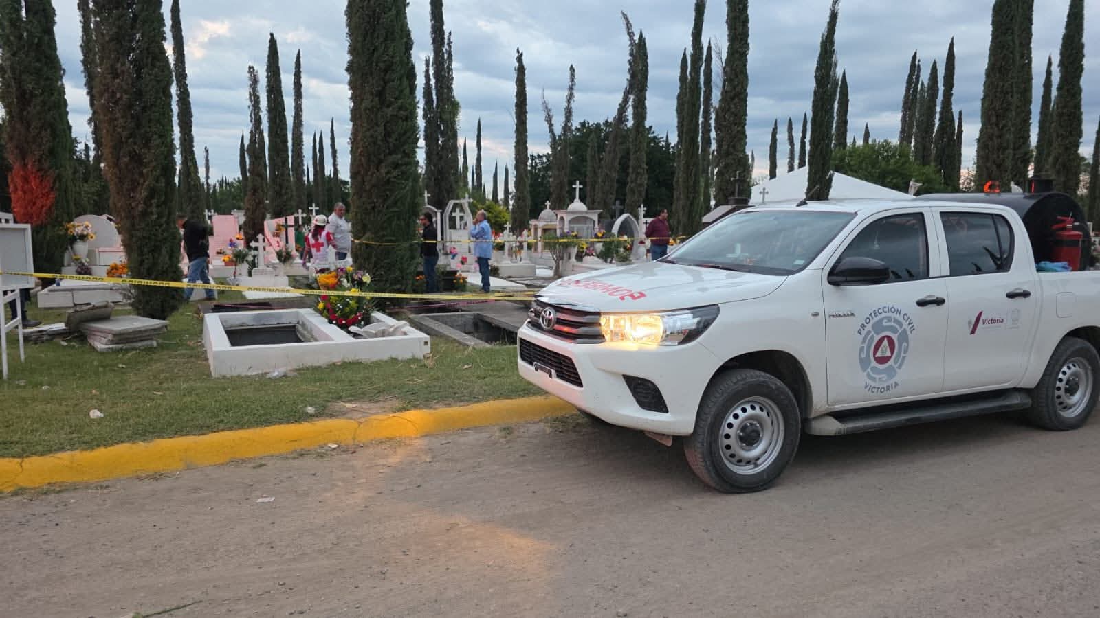 Elementos del Cuerpo de Bomberos Victoria atendieron el reporte de una persona adulta que cayó en una tumba de aproximadamente dos metros de profundidad dentro del Panteón Jardines del Reencuentro.