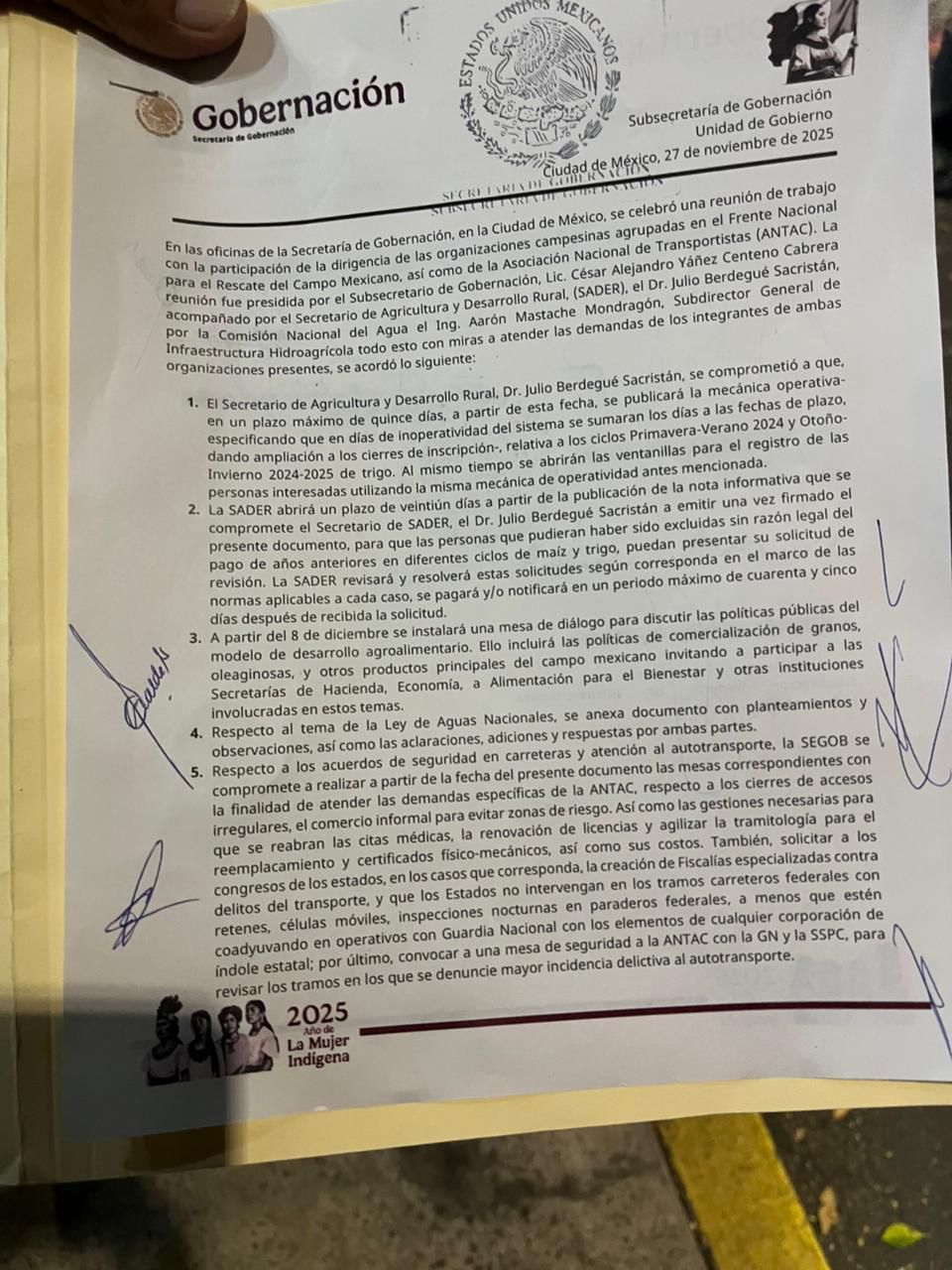 La Segob confirmó que los manifestantes se comprometieron a levantar de forma inmediata los bloqueos carreteros que mantuvieron en diversos estados del país para terminar con la afectación al libre tránsito de la población y restablecer el paso de los servicios de emergencia.