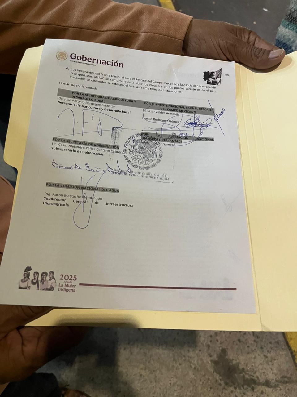 Los Agricultores y Transportistas difundieron una minita con los acuerdos que establecen compromisos puntuales para algunos puntos, abren camino al diálogo y construcción de mejores políticas públicas para el campo en otros, además de comprometerse a tomar en cuenta la visión de los agricultores en la reforma a la Ley de Aguas Nacionales.