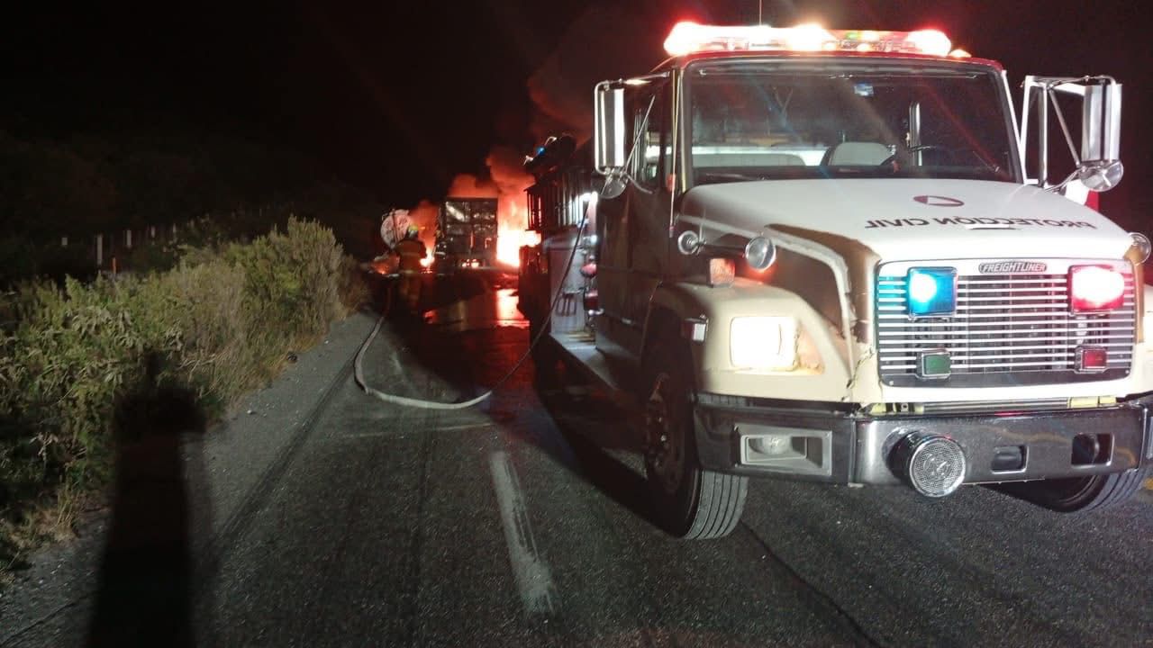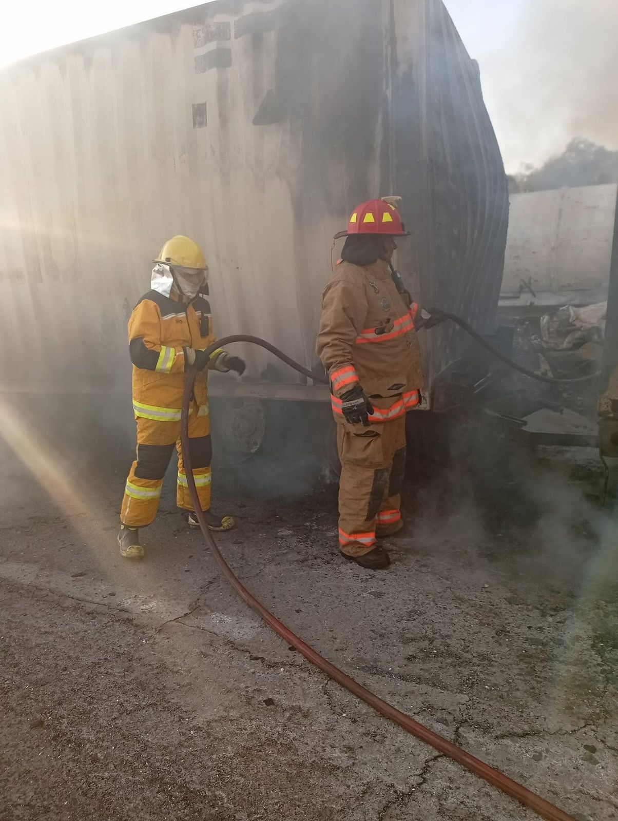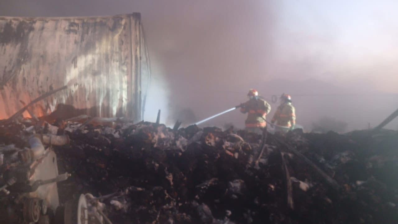 Bomberos Estatales con unidades contraincendio trabajaron para extinguir el fuego que consumió parcialmente las unidades de carga.