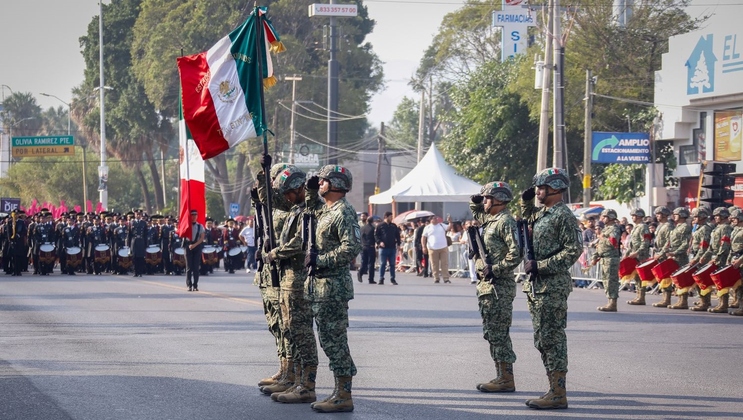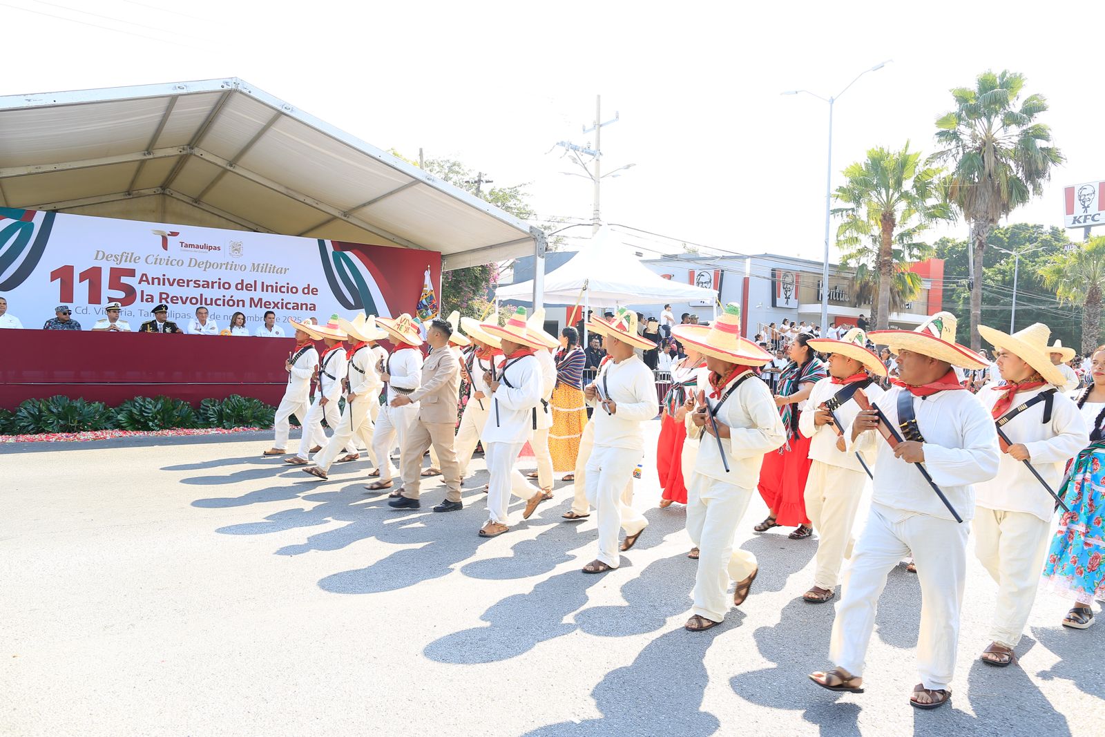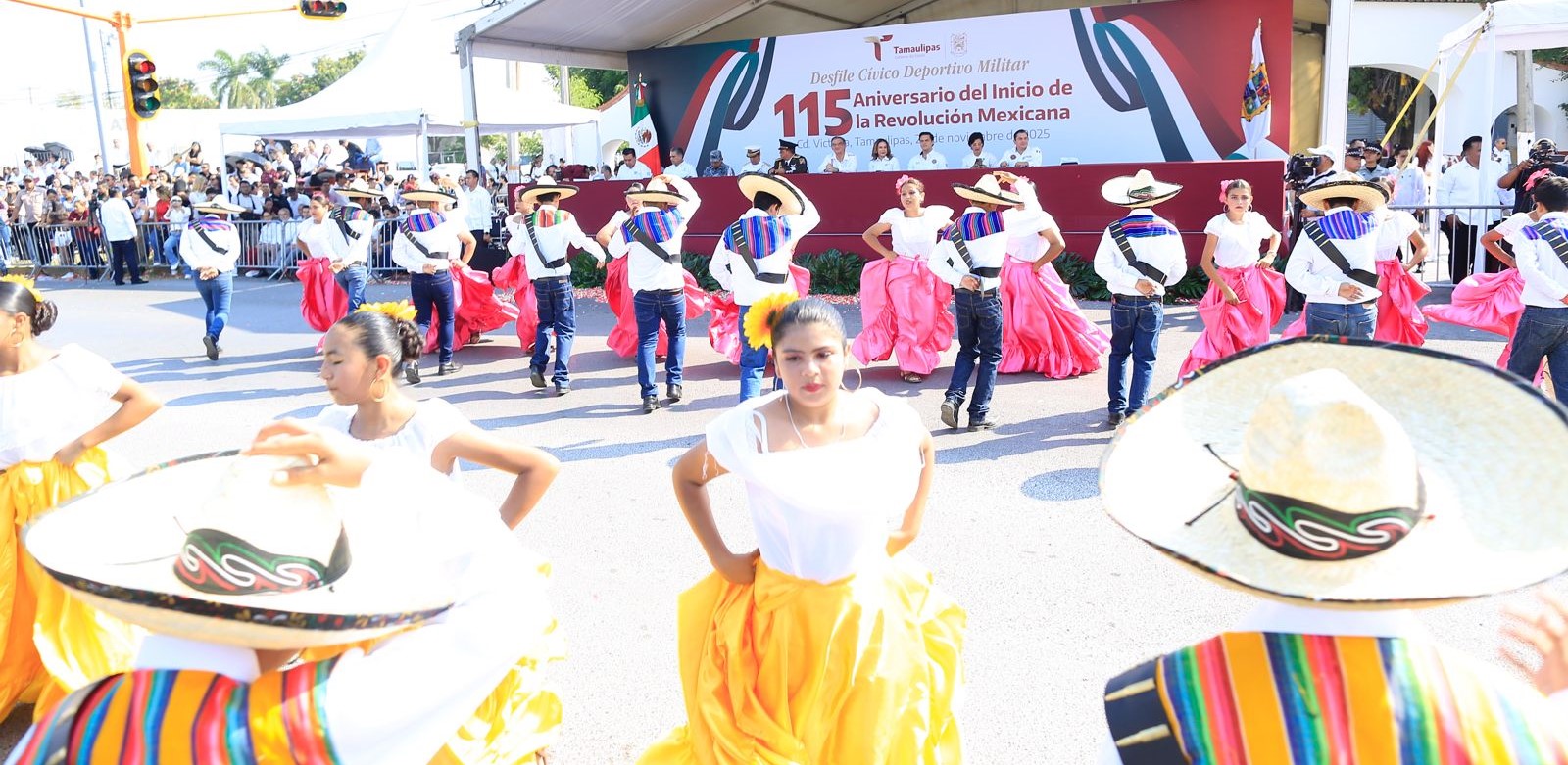 En un marco lleno de folclor, música tradicional mexicana, majestuosos vestuarios y mucho colorido, con representaciones de los caudillos revolucionarios, bailables y tablas gimnásticas, también desfilaron a lo largo del bulevar Tamaulipas 255 integrantes del Ejército Mexicano, Fuerza Aérea y Guardia Nacional, y 724 elementos de la Guardia Estatal, haciendo un total de más de 3,500 participantes.
