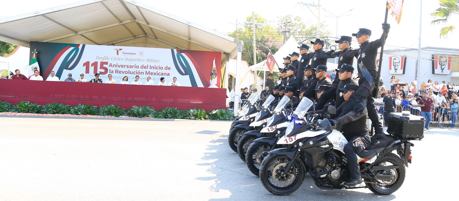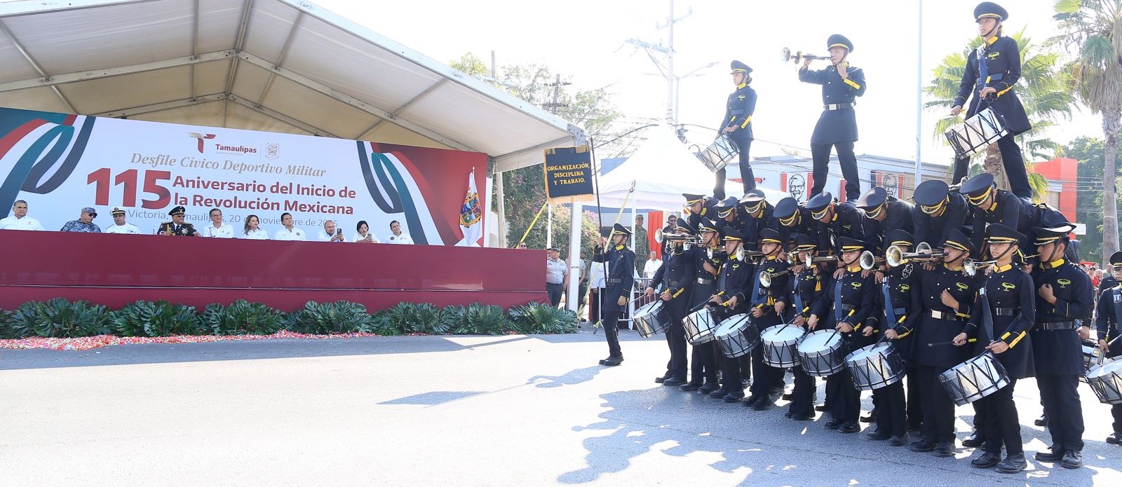 Ciudad Victoria, Tamaulipas.- Con la presentación, por primera vez, de una banda de guerra monumental integrada por 500 alumnos y alumnas de diferentes municipios, este jueves se conmemoró el desfile cívico, deportivo y militar, con la entusiasta participación de estudiantes, jóvenes, niñas y niños, en conmemoración del 115 aniversario del inicio de la Revolución Mexicana, presidido por el gobernador Américo Villarreal Anaya.
