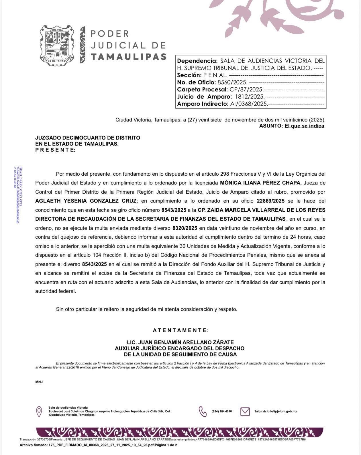 Ciudad Victoria, Tamaulipas (28 de novimbre de 2025).- Por orden de un juez federal, la multa de un millón 390 mil 400 pesos impuesta a la abogada Aglaeth Yesenia González Cruz quedó suspendida.