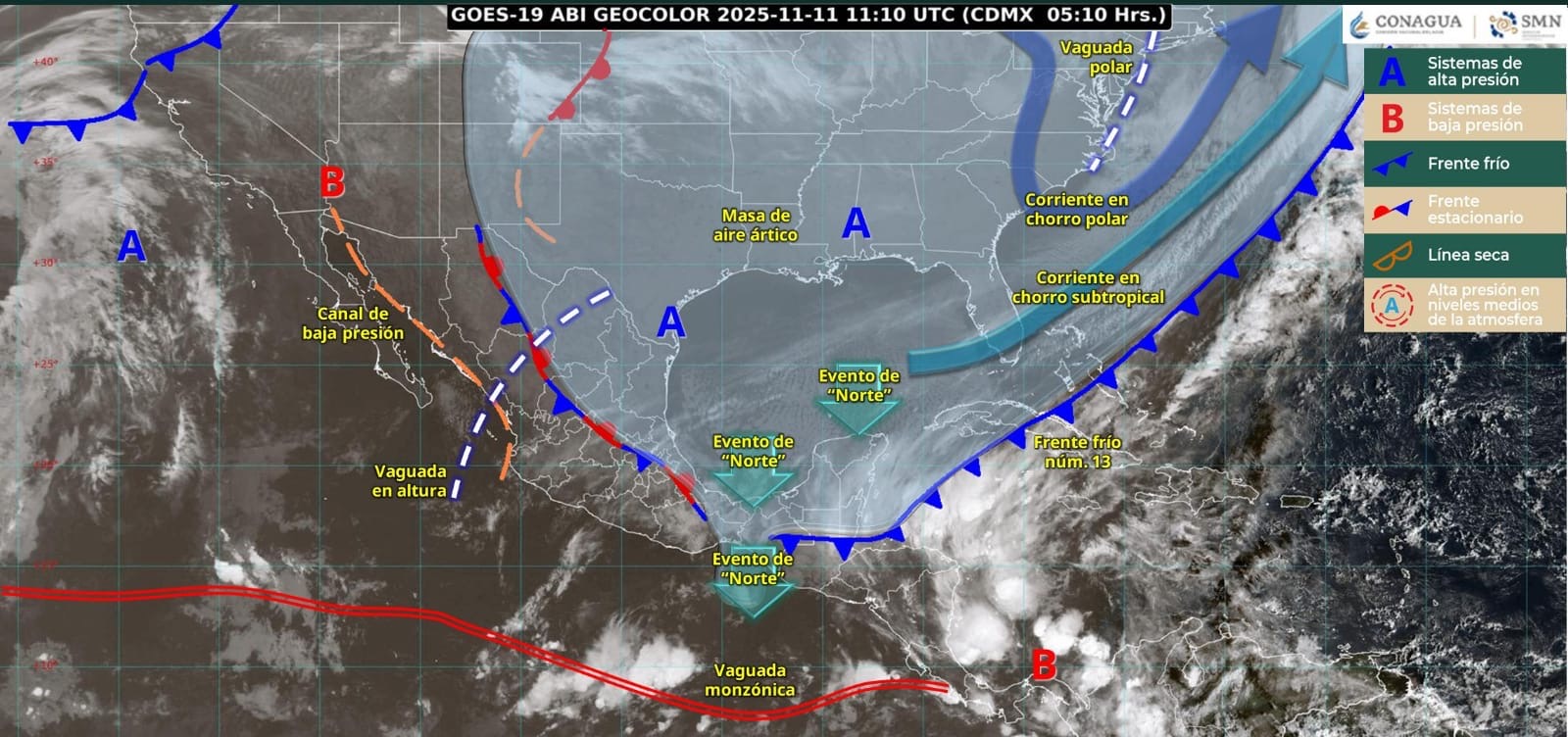Ciudad Victoria, Tamaulipas (11 de noviembre de 2025). – Para hoy, la masa de aire ártico asociada al frente frío número 13, mantendrá ambiente frío a muy frío en el norte, noreste, oriente y centro de la República Mexicana, informó el Servicio Meteorológico Nacional.