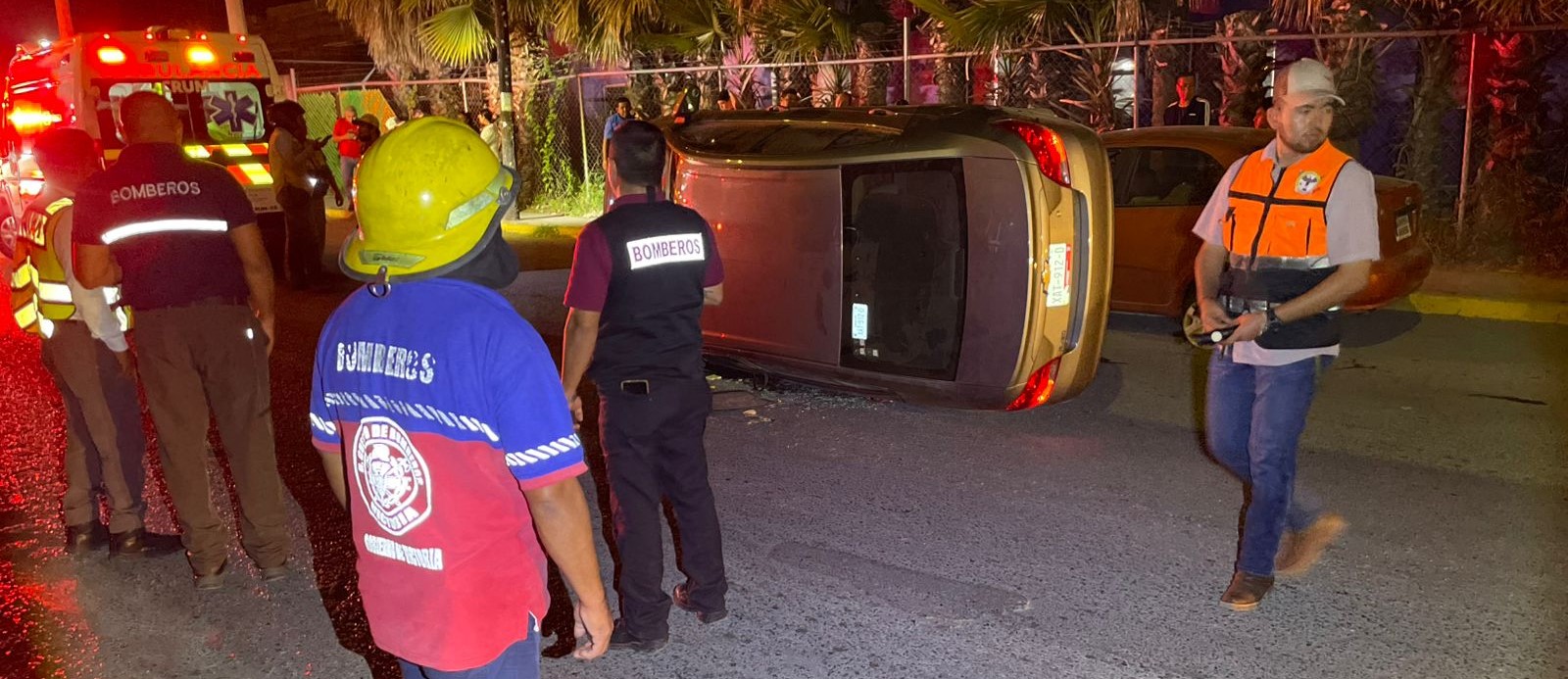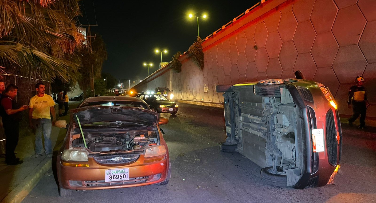 Tres personas lesionadas, entre ellas dos menores de edad, además de cuantiosos daños materiales, fue el saldo de un choque con volcadura registrado esta noche en el Bulevar Adolfo López Mateos.