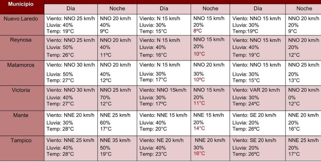 CIUDAD VICTORIA. – El área de meteorología de la Coordinación Estatal de Protección Civil, con información del Servicio Meteorológico Nacional, informó que el frente frío número 21, impulsado por aire ártico, cruzará Tamaulipas en el transcurso del domingo.