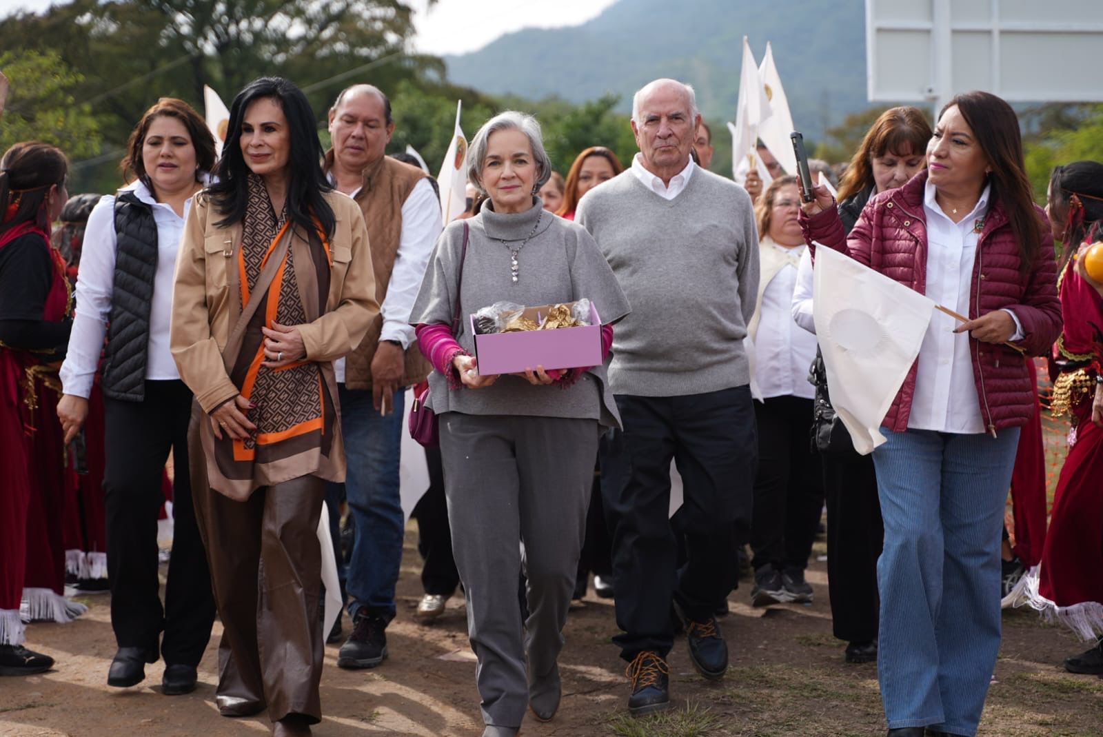 Durante la emotiva ceremonia estuvieron presentes el padre Salvador Paniagua Baeza, responsable de la gestión de la bendición papal, danzantes locales, así como Silvia Casas González, secretaria de Bienestar; Blanca Valles Rodríguez, secretaria general del SUTSPET, el director general de ITAVU, Manuel Guillermo Treviño Cantú; la maestra Elizabeth Pesquera Caballero, escultora de la obra monumental, entre otros invitados.