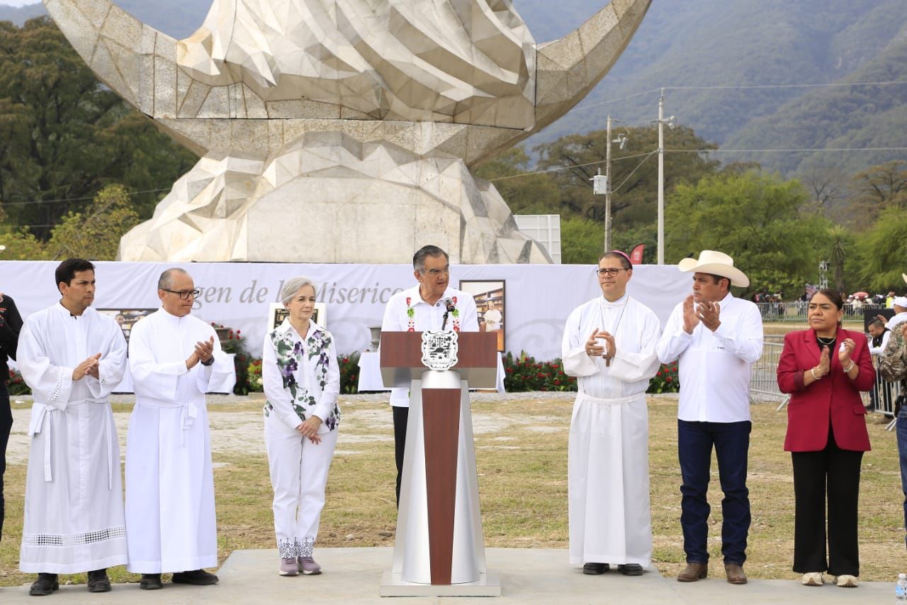 Acompañado por la doctora María de Villarreal, presidenta del Sistema DIF Estatal, y del obispo de la Diócesis de Victoria, monseñor Óscar Efraín Tamez Villarreal, y ante miles de asistentes que llegaron para admirar la imagen que se erige imponente en la falda de la Sierra Madre Oriental, el gobernador hizo un llamado para mostrar que Tamaulipas es un pueblo que camina en unidad.