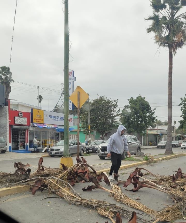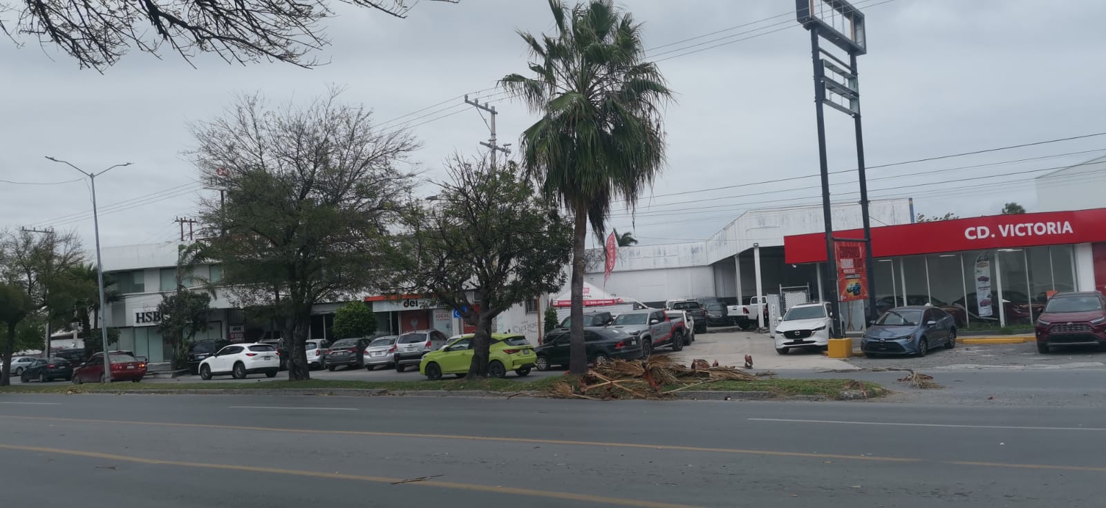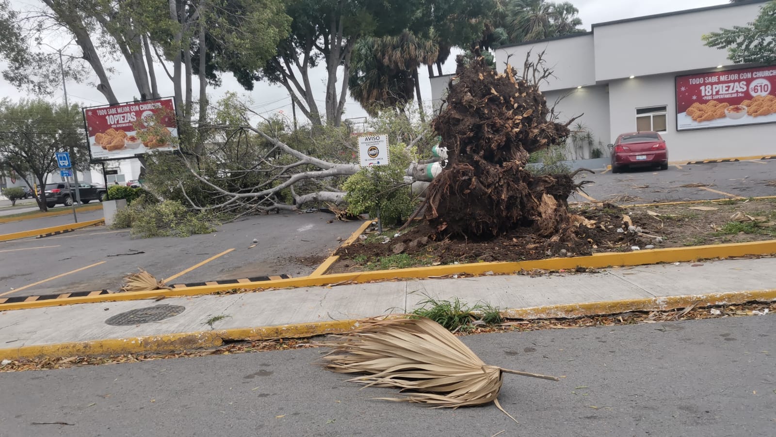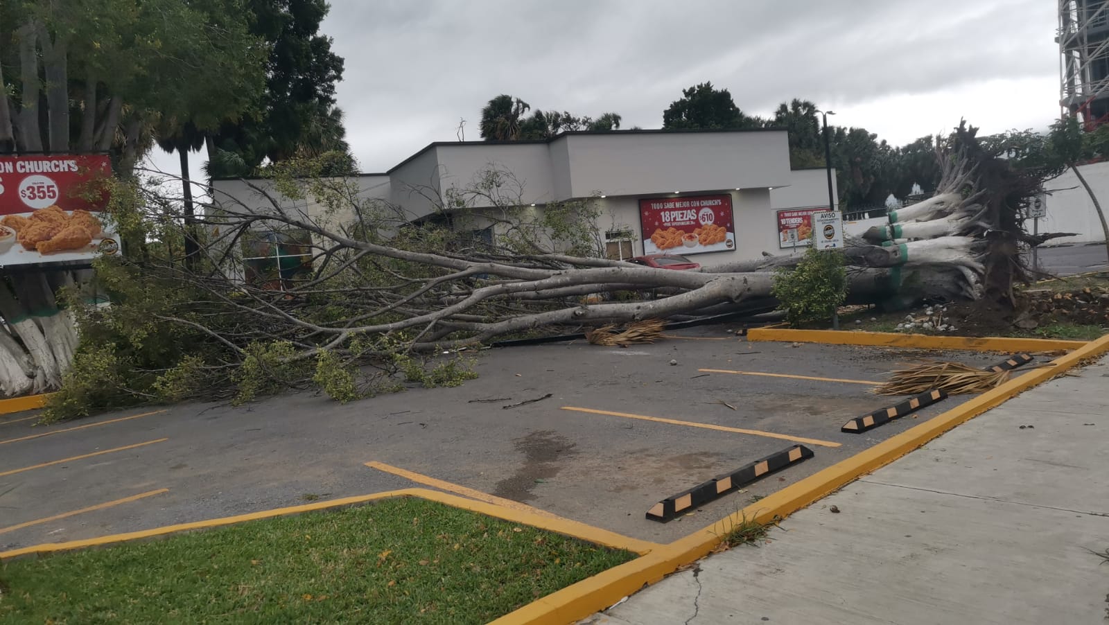 Uno de los incidentes más aparatosos ocurrió en el crucero del Ocho y Veracruz, donde un enorme árbol colapsó desde la raíz dentro del estacionamiento de un conocido restaurante de comida rápida. A pocos metros, sobre la misma calle Ocho antes de llegar al Bulevar Enrique Cárdenas González, una rama de gran tamaño bloqueó el carril lateral en sentido sur a norte, dificultando el tránsito vehicular.
