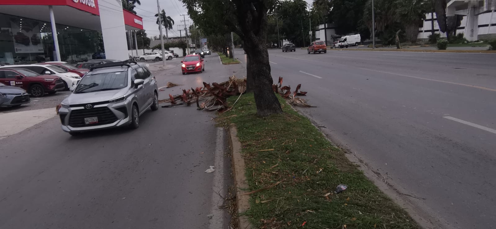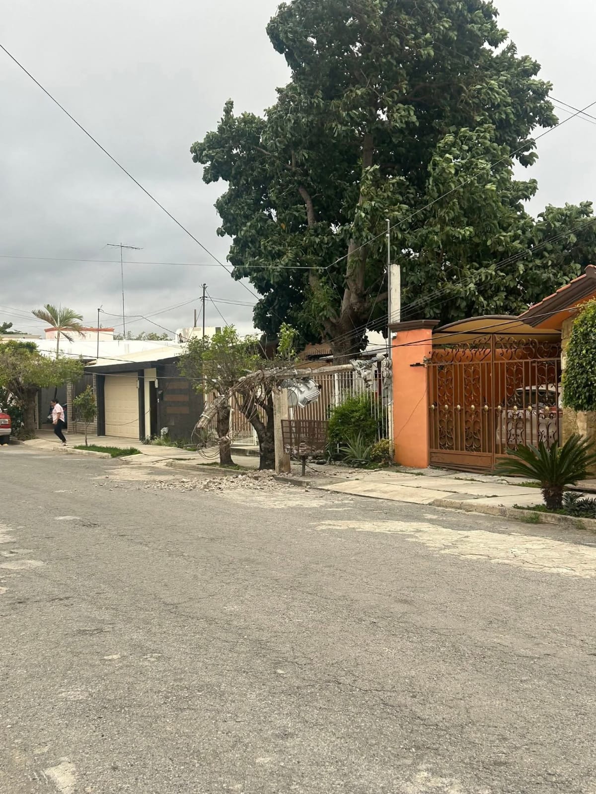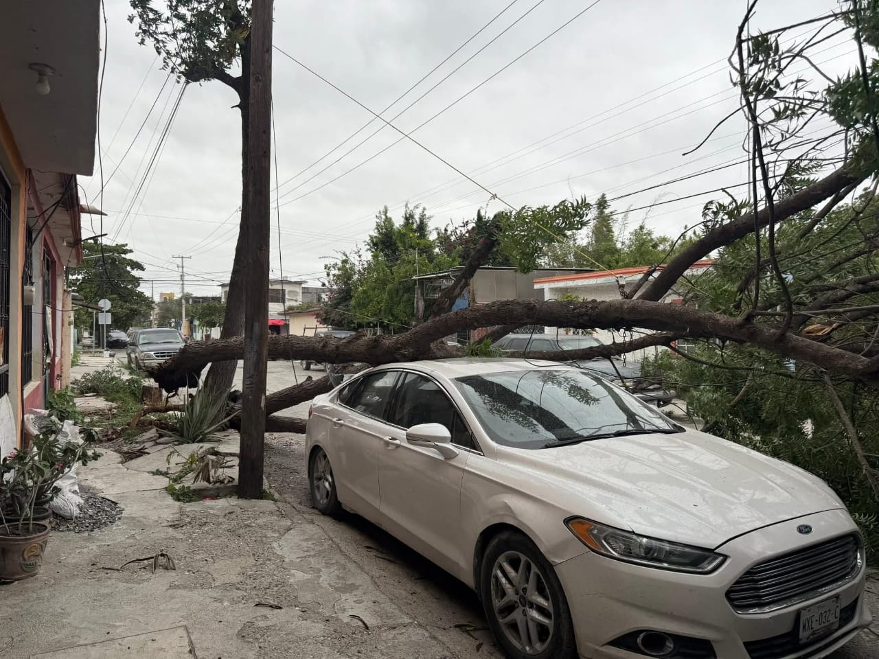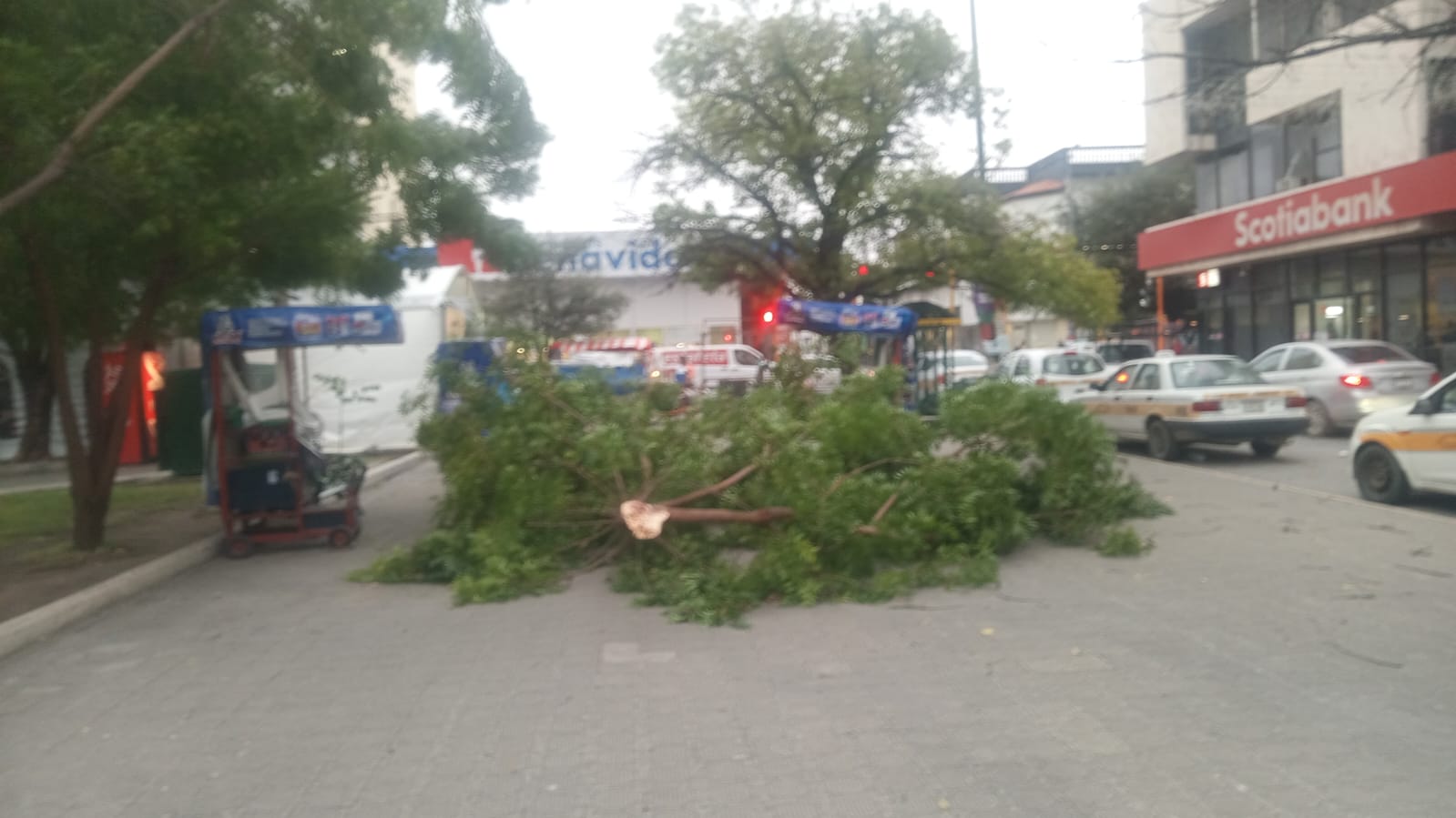 Uno de los incidentes más aparatosos ocurrió en el crucero del Ocho y Veracruz, donde un enorme árbol colapsó desde la raíz dentro del estacionamiento de un conocido restaurante de comida rápida. A pocos metros, sobre la misma calle Ocho antes de llegar al Bulevar Enrique Cárdenas González, una rama de gran tamaño bloqueó el carril lateral en sentido sur a norte, dificultando el tránsito vehicular.