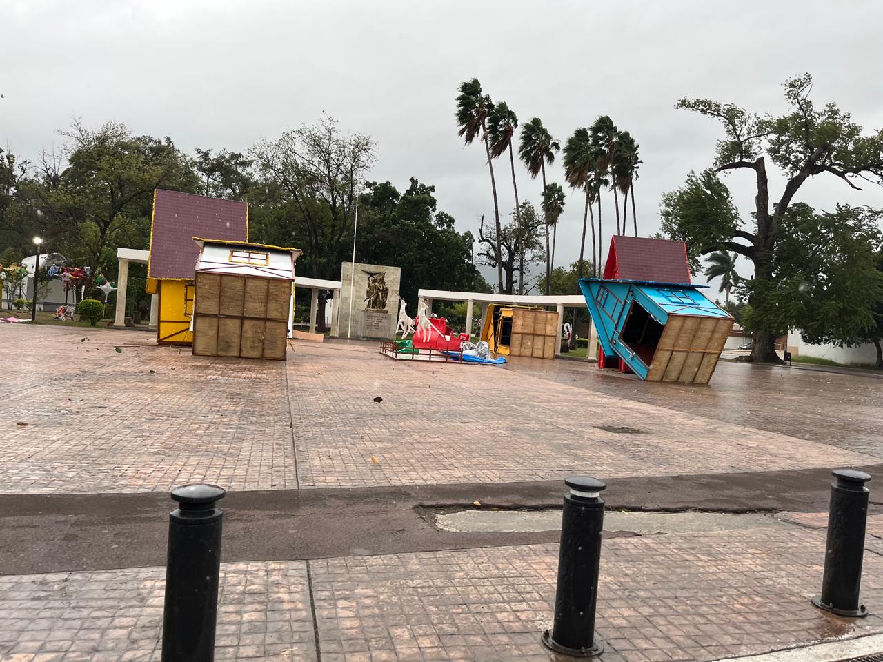 El temporal no perdonó los espacios públicos. En el Paseo Méndez y la Plaza Juárez, los adornos navideños fueron arrancados por el viento, mientras que en la Plaza Hidalgo se reportó la caída constante de ramas.