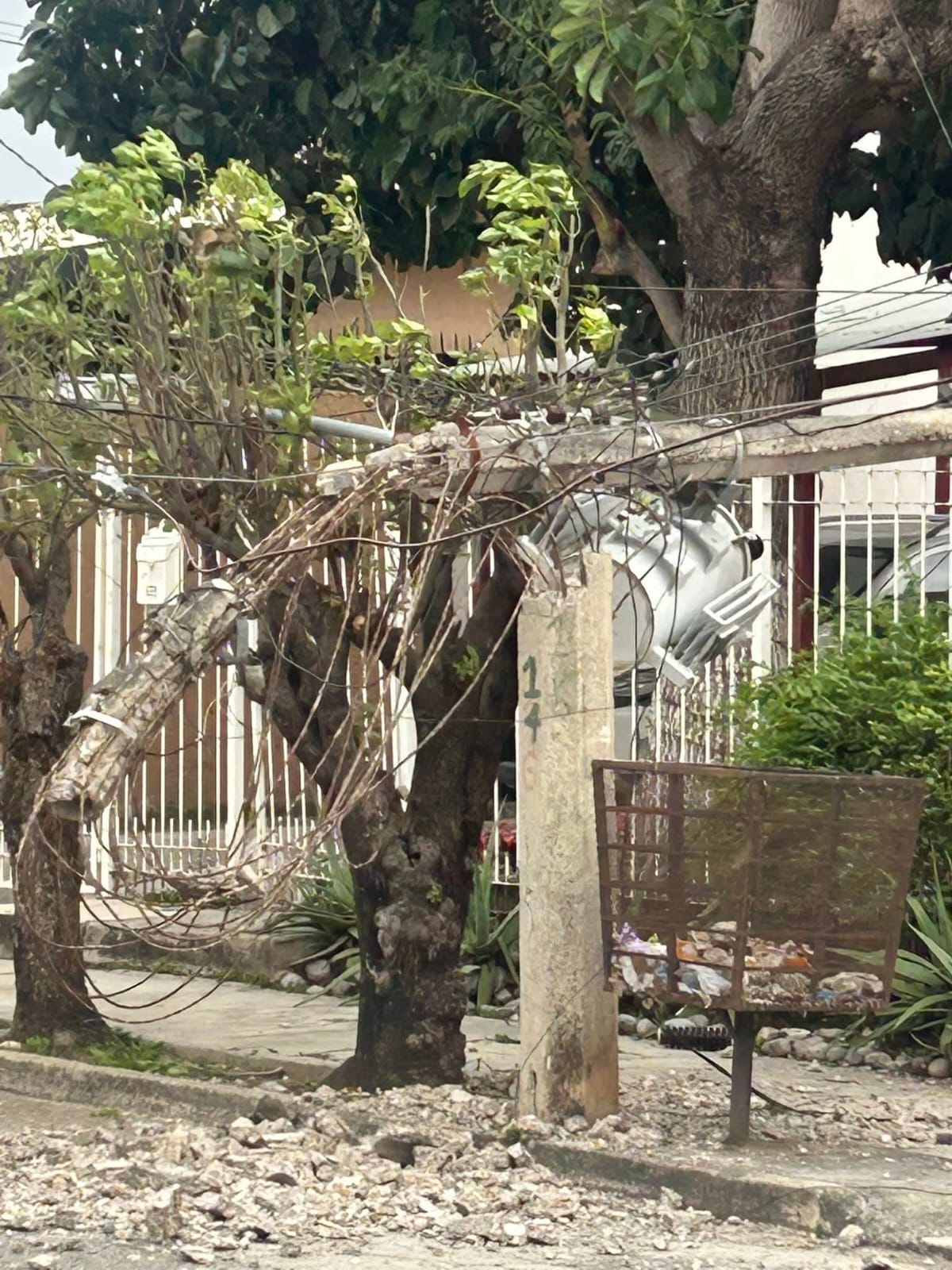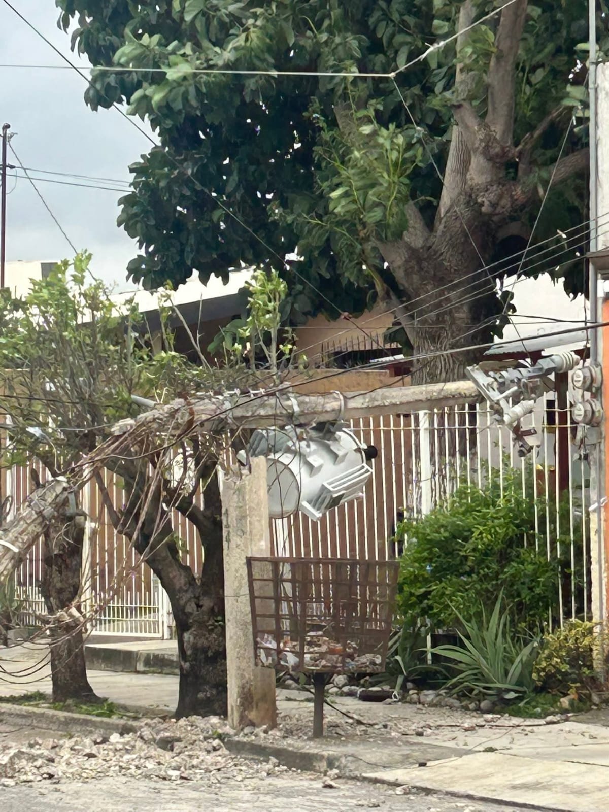 La emergencia más crítica se registró en el 19 y 20 Sierra Madre del fraccionamiento Villarreal, donde un poste de concreto junto con su transformador colapsó sobre un domicilio particular, generando un llamado de auxilio urgente por parte de los residentes.