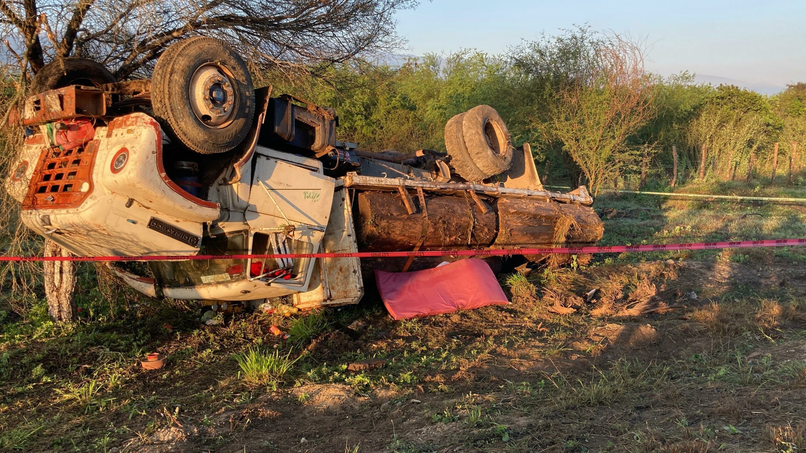 De acuerdo con las versiones preliminares, una camioneta Ford Ranger presuntamente invadió el carril del camión maderero. Ante el riesgo de una colisión frontal, el operador de la unidad pesada realizó una maniobra evasiva que provocó que el vehículo cayera en un dren pluvial cercano. Al caer, el camión volcó y dio varias volteretas, esparciendo su carga de madera.
