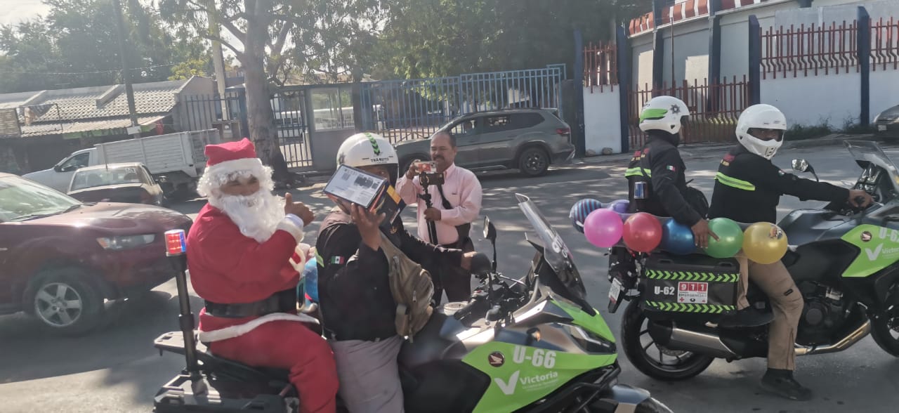 Ciudad Victoria, Tamaulipas (24 de diciembre de 2025).- A unas horas del festejo de la Nochebuena y Navidad, elementos de la Dirección de Seguridad, Tránsito y Vialidad repartieron regalos y juguetes en diferentes centros hospitalarios de esta Ciudad Capital.