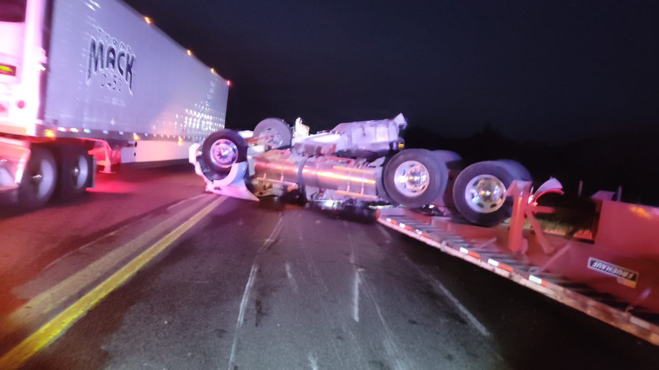 TULA, TAMAULIPAS. — Derivado de la volcadura de un tractocamión con remolque, la circulación en la Carretera Federal 101 tramo Tula- Victoria se encuentra parcialmente obstruida en el carril lateral con sentido de norte a sur, a la altura del kilómetro 44, aproximadamente a un kilómetro del paradero Villa 45.