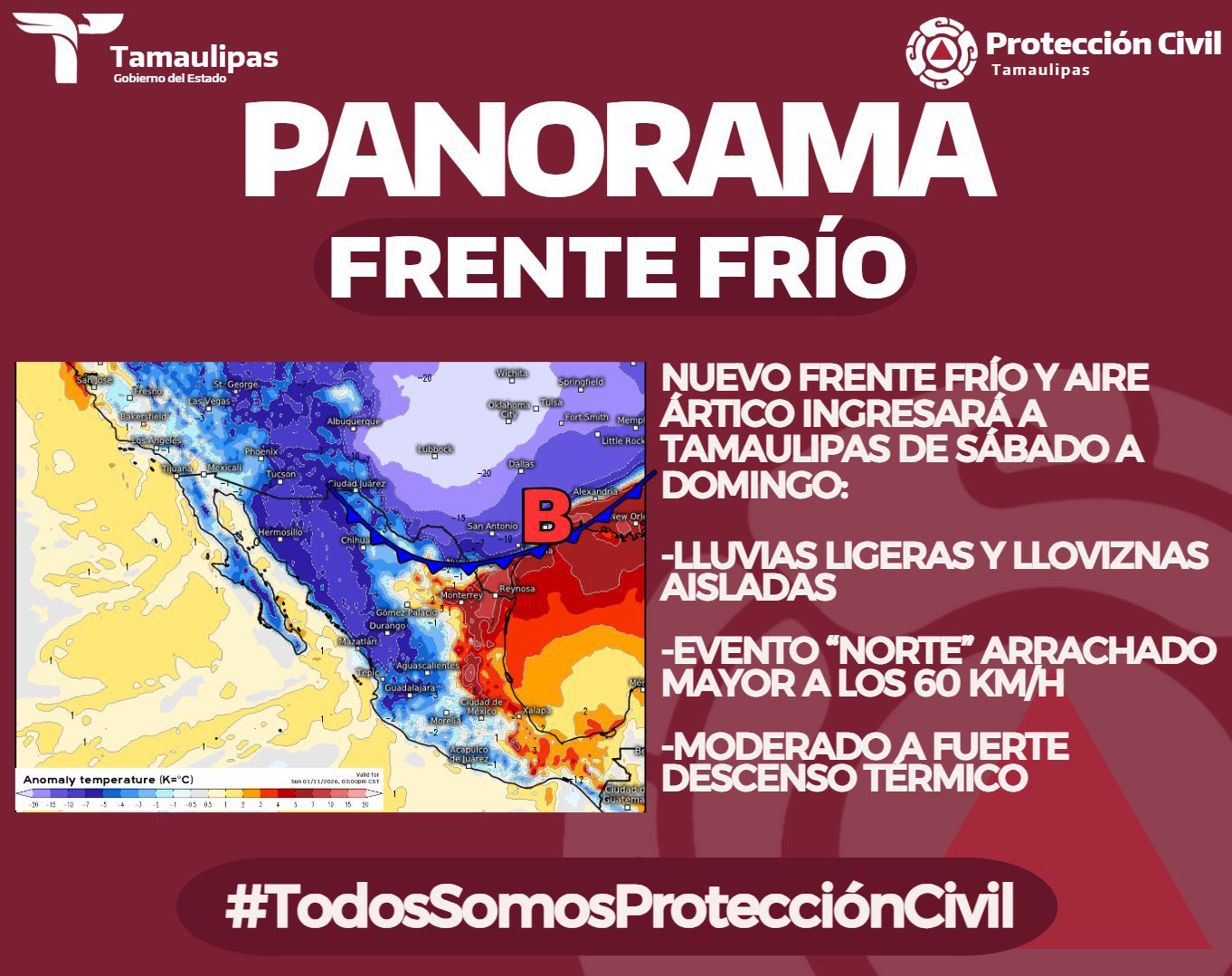 Ciudad Victoria, Tamaulipas (21 de enero de 2026).- La Coordinación de Protección Civil Tamaulipas mantiene monitoreo permanente ante el probable ingreso de una masa de aire ártico al estado entre sábado y domingo, fenómeno que podría provocar un descenso moderado a fuerte en las temperaturas.