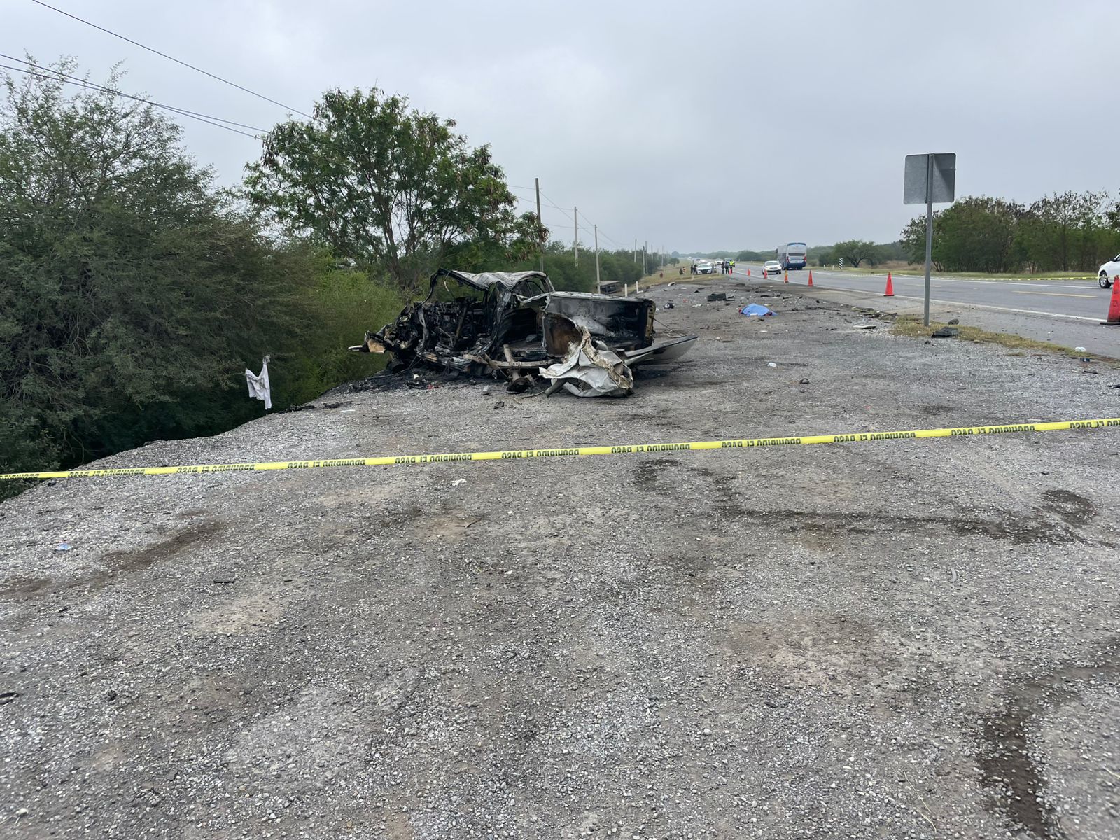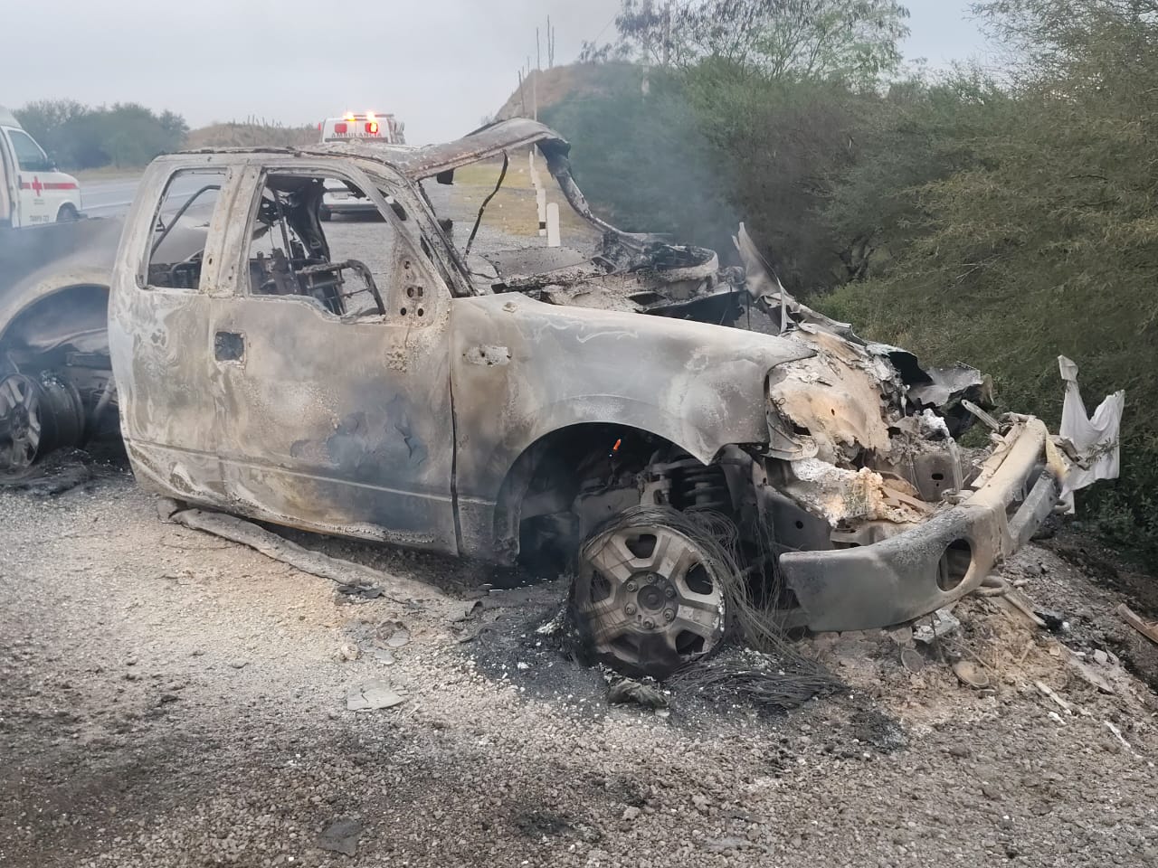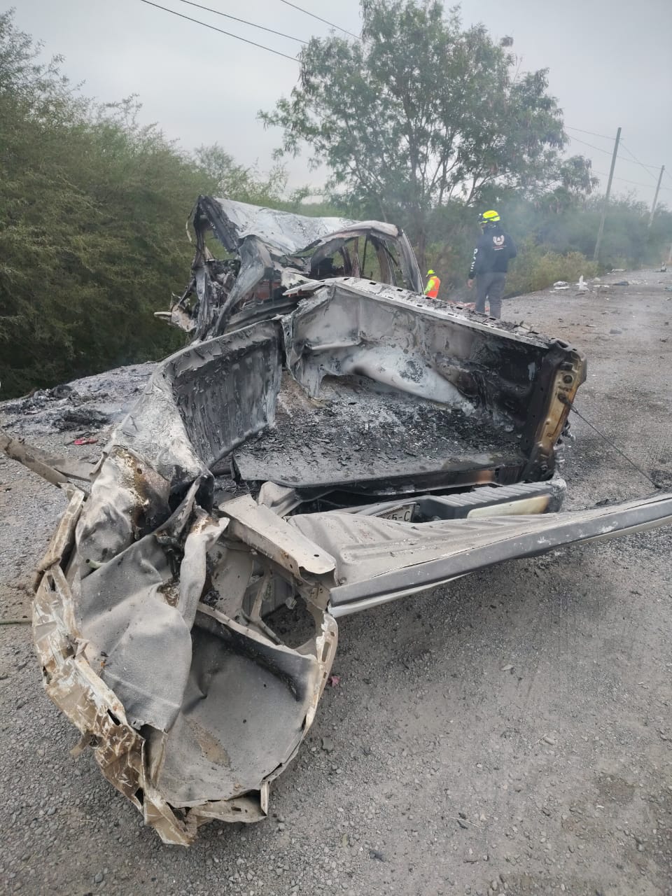 Debido al fuerte impacto, la camioneta se incendió, quedando reducida a chatarra.