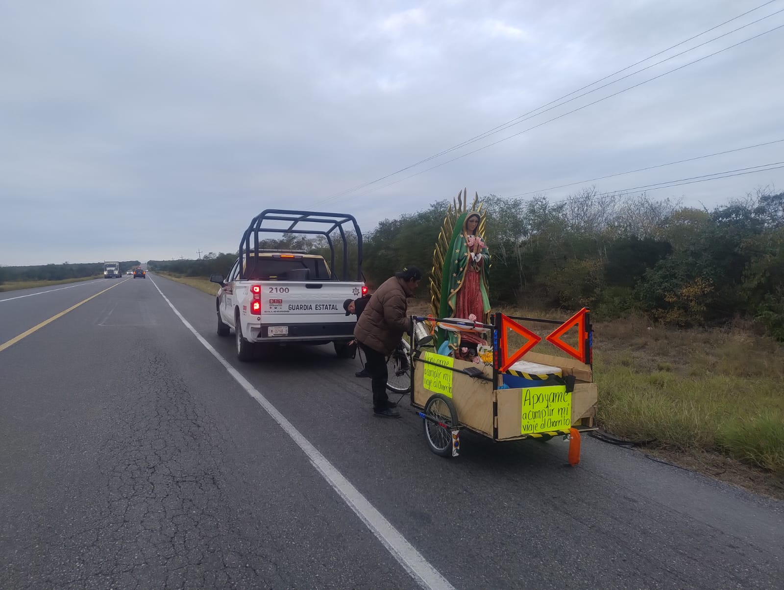 Para cumplir con su promesa, el peregrino utiliza una bicicleta tricarga donde transporta una imagen de la Virgen de Guadalupe. Debido al mal tiempo y la escasa visibilidad en las carreteras, recibió apoyo crucial por parte de la Guardia Estatal de Apoyo Carretero. Los agentes de la Estación Segura Vicente Norte le brindaron refugio y café caliente, permitiéndole pernoctar en un lugar seguro y evitar los peligros del tránsito nocturno.