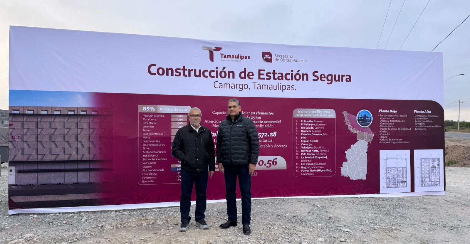 Acompañado por el secretario de Obras Públicas de Tamaulipas, Pedro Cepeda Anaya, el titular de la Secretaría de Seguridad Pública realizó un recorrido por la Estación Camargo, cuya edificación presenta un avance del 85 por ciento. Esta obra forma parte de un proyecto integral que contempla la construcción de 15 Estaciones Seguras, las cuales estarán distribuidas estratégicamente cada 25 kilómetros a lo largo de la franja fronteriza.