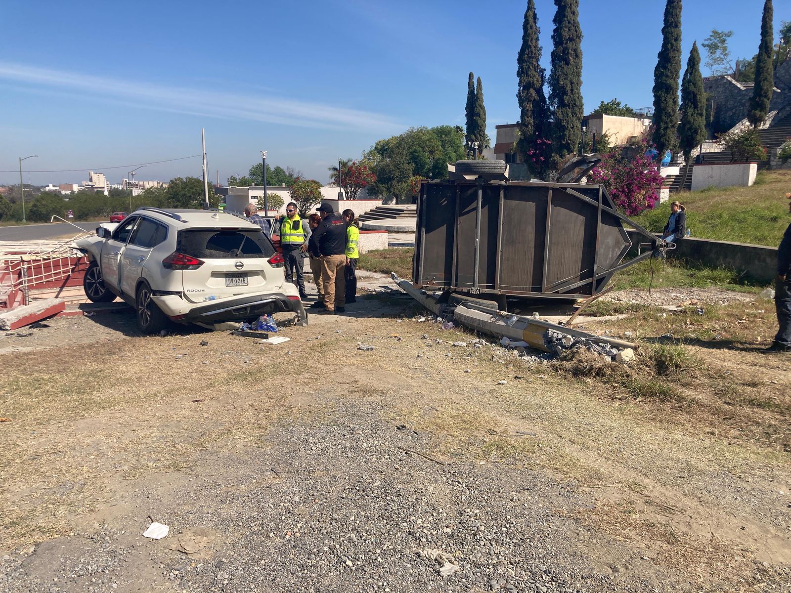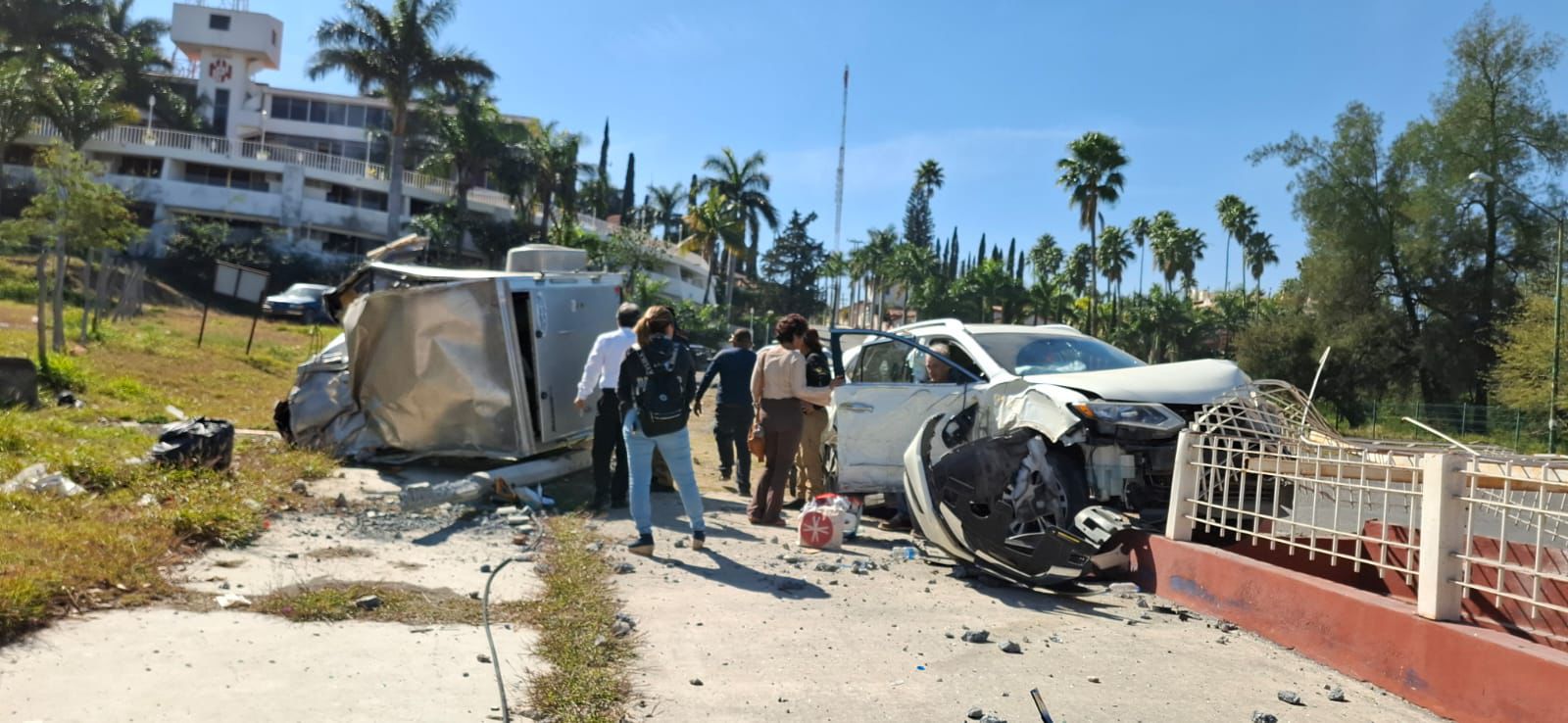 La trayectoria fuera de control derivó en una doble colisión. En primera instancia, el remolque se proyectó directamente contra un poste de concreto, el cual resultó completamente destruido por la fuerza del choque.