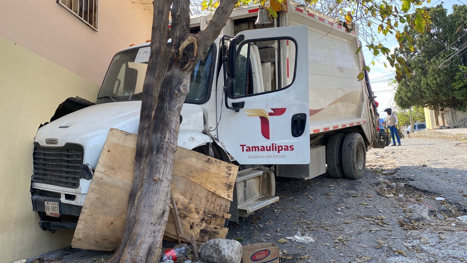 Ciudad Victoria, Tamaulipas (12 de febrero de 2026).- Un camión de limpieza pública del Ayuntamiento de Ciudad Victoria se impactó contra la pared de una vivienda luego de presentar una presunta falla en el sistema de frenos mientras realizaba su recorrido.