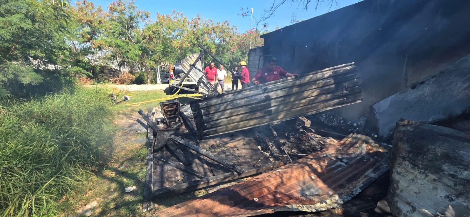 En el Fraccionamiento Las Alazanas, los elementos atendieron el reporte de un incendio que ya se encontraba avanzado al momento de su llegada. El fuego consumía un inmueble tipo tejabán, cuya estructura de madera y lámina favoreció la propagación inmediata de las llamas por toda la superficie.