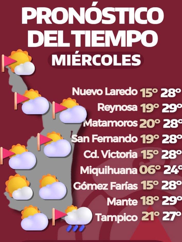 Ciudad Victoria, Tamaulipas.– Protección Civil Tamaulipas informó que para este miércoles se prevé un ambiente cálido, así como la presencia de un evento de “Surada” con ráfagas de viento que podrían alcanzar entre los 35 y 55 kilómetros por hora durante la tarde.