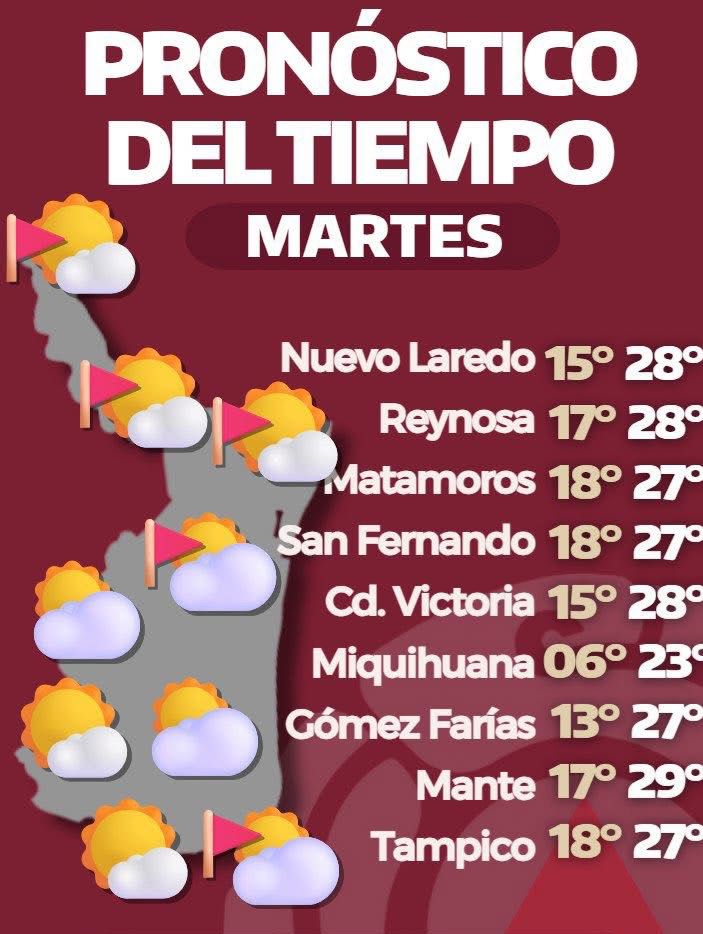 Ciudad Victoria, Tamaulipas (10 de enero de 2026).- La dirección de Protección Civil Tamaulipas comunicó que, para la tarde de este martes, se anticipa un ascenso en las temperaturas, estableciendo un ambiente cálido en la región. Sin embargo, este pronóstico viene acompañado del fenómeno conocido como “Surada”, el cual generará rachas de viento de entre 35 y 55 kilómetros por hora.