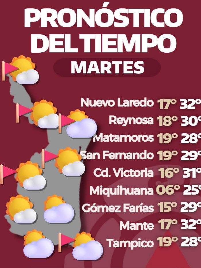 Ciudad Victoria, Tamaulipas.— El estado se prepara para un marcado ascenso térmico. De acuerdo con el reporte de Protección Civil Tamaulipas, para este martes se anticipa un ambiente cálido en la mayor parte de la región, con termómetros que alcanzarán máximas de 33°C.