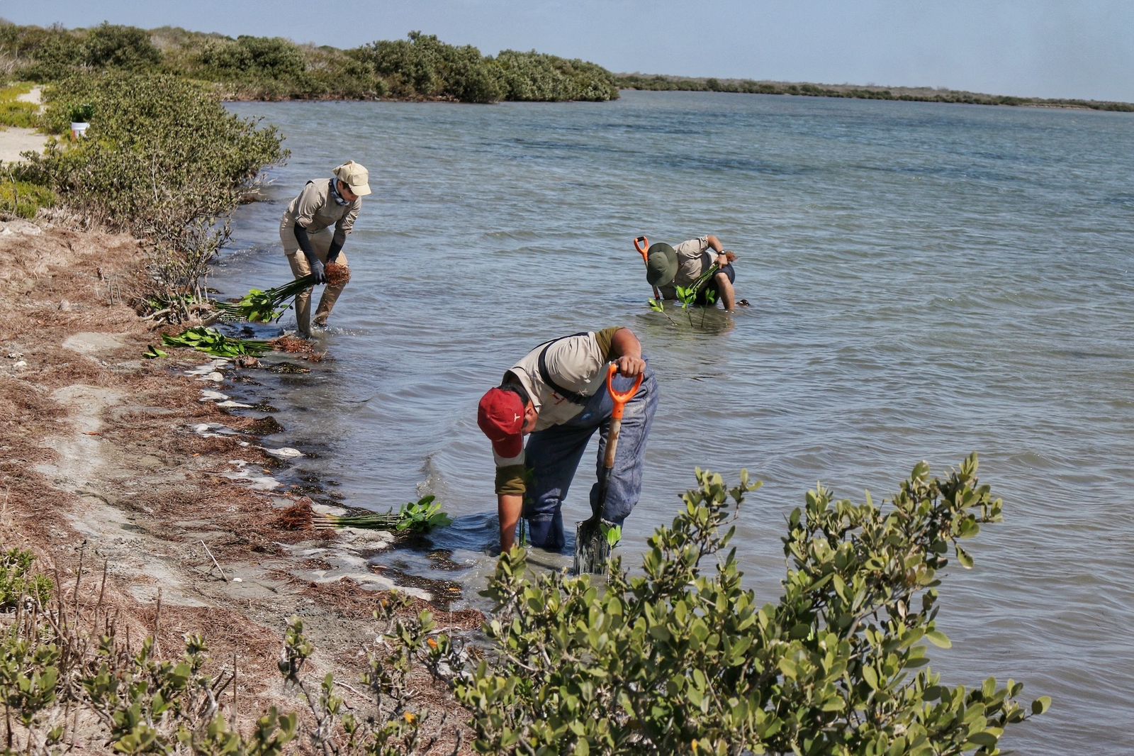 Las acciones de restauración se realizan con mangle negro (Avicennia germinans) y mangle rojo (Rizophora mangle), especies fundamentales para la protección del litoral y la biodiversidad costera.