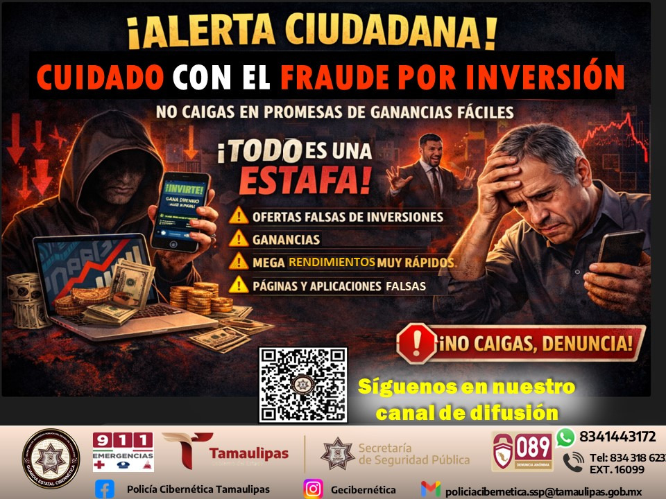 Ciudad Victoria, Tamaulipas (3 de febrero de 2026).- La Secretaría de Seguridad Pública de Tamaulipas (SSPT), mediante la Guardia Estatal Cibernética, ha puesto en marcha una campaña informativa para dotar a la población de herramientas críticas que permitan identificar y evadir esquemas de fraude por inversión, los cuales suelen presentarse bajo la promesa de rendimientos atípicos.