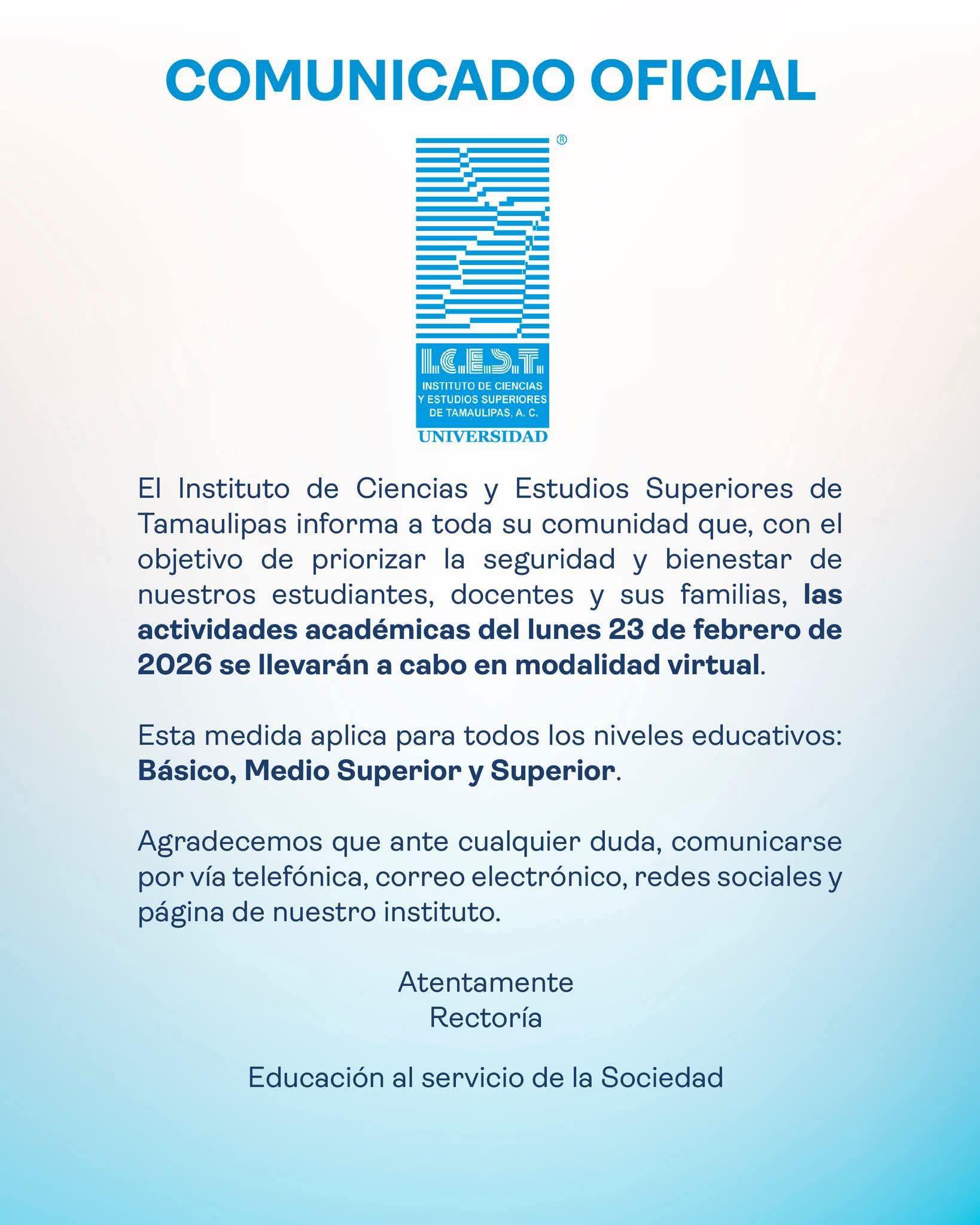 “El Instituto de Ciencias y Estudios Superiores de Tamaulipas informa a toda su comunidad que, con el objetivo de priorizar la seguridad y bienestar de nuestros estudiantes, docentes y sus familias, las actividades académicas del lunes 23 de febrero de 2026 se llevarán a cabo en modalidad virtual.”