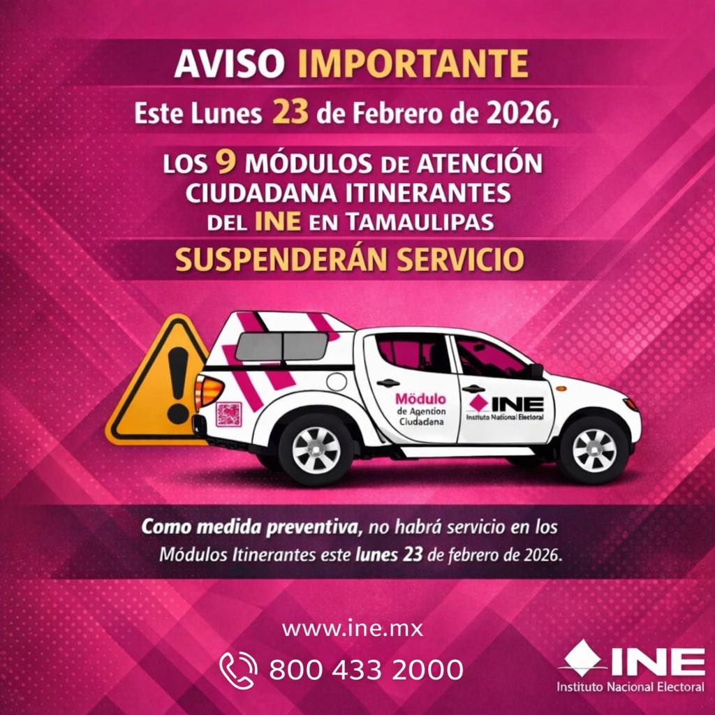 Ciudad Victoria, Tamaulipas (23 de febrero de 2026).- A partir del lunes 23 de febrero, el Instituto Nacional Electoral (INE) interrumpirá las actividades de sus Módulos de Atención Ciudadana en Tamaulipas. Esta determinación, de carácter preventivo, responde a la necesidad de garantizar la seguridad física tanto de la ciudadanía como de los empleados del organismo ante eventos recientes de inseguridad reportados en distintas zonas del territorio nacional.