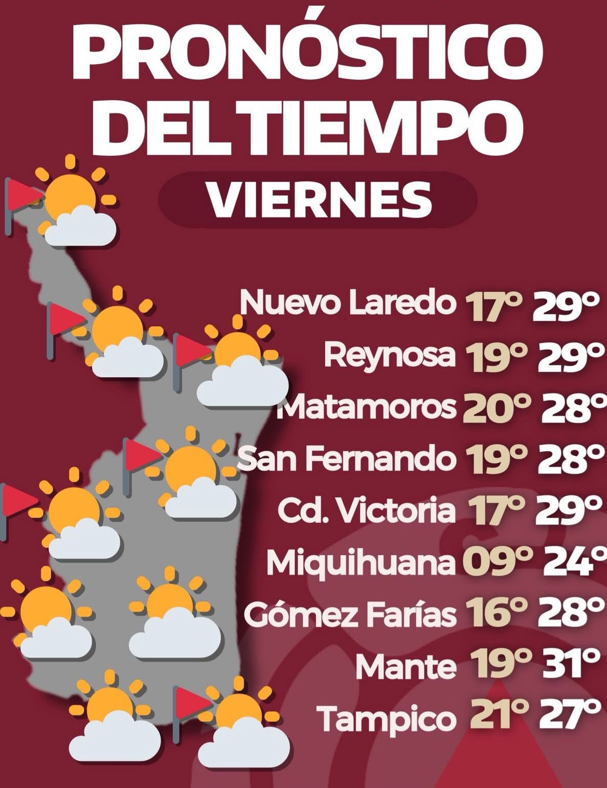 Ciudad Victoria, Tamaulipas (13 de febrero de 2026).- Tamaulipas experimentarán un viernes de contrastes climáticos. De acuerdo con el reporte más reciente de Protección Civil Tamaulipas, se pronostica un ambiente cálido durante la tarde, con termómetros que oscilarán entre los 27°C y 31°C en la mayor parte de la entidad.