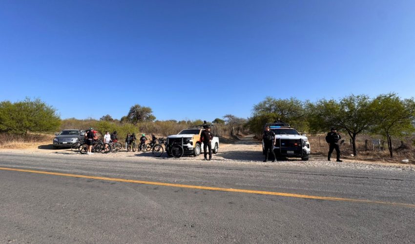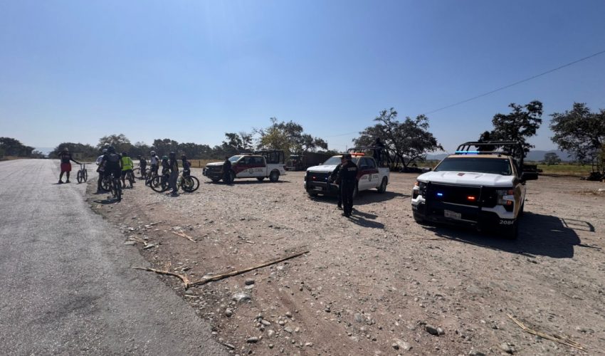 Tula, Tamaulipas.– Personal de la Guardia Estatal brinda apoyo de seguridad y resguardo perimetral durante la realización de la “Rodada x Tamaulipas”, encabezada por el ciclista de alto rendimiento César Vallejo Ledezma, en un recorrido efectuado sobre la carretera estatal 66, en el tramo Tula–Ocampo.