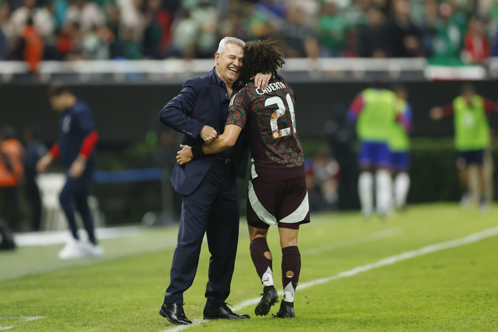 MEX2181. GUADALAJARA (MÉXICO),15/10/2024.- César Huerta de México celebra un gol ante Estados Unidos junto a su entrenador Javier Aguirre, este martes durante un partido amistoso en el Estadio Akron, en Guadalajara (México). EFE/ Francisco Guasco