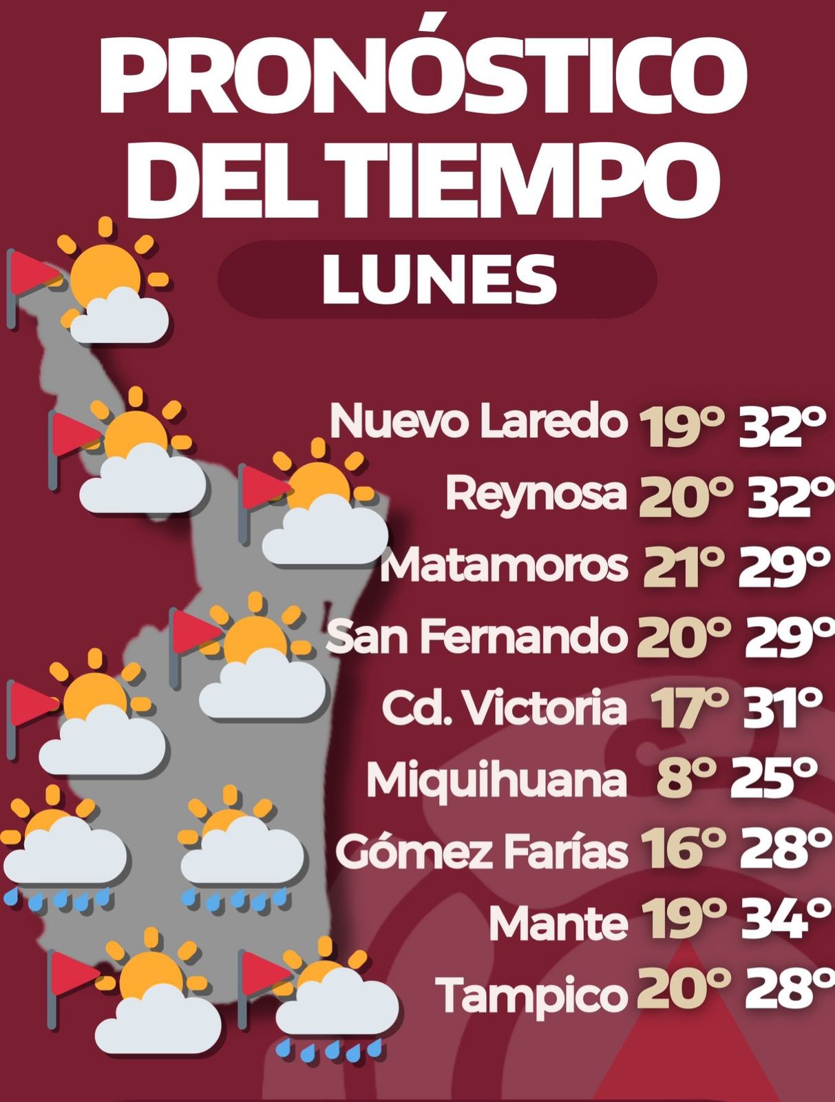El ambiente se tornará cálido durante la tarde de este lunes en territorio tamaulipeco. Respecto a las precipitaciones, se estiman probabilidades de lluvia aislada por la mañana en la zona sur y chubascos dispersos en el Altiplano durante las horas de la tarde.