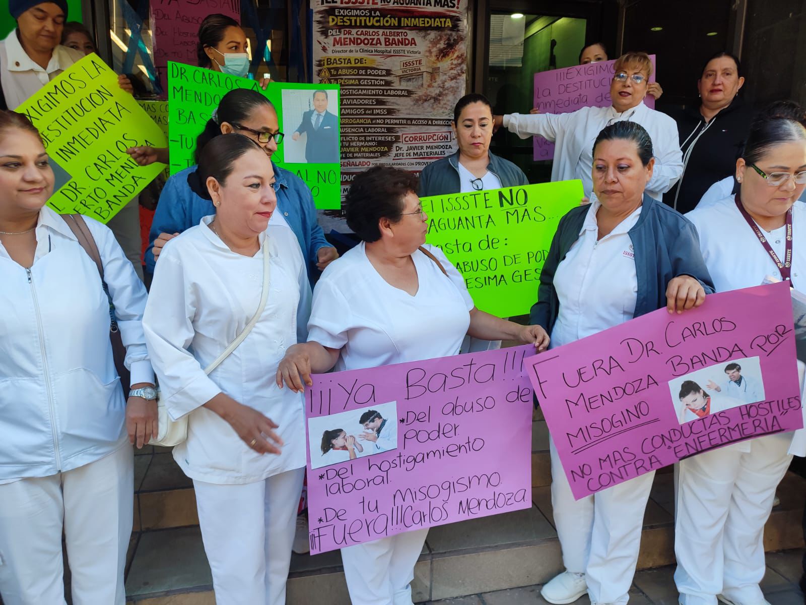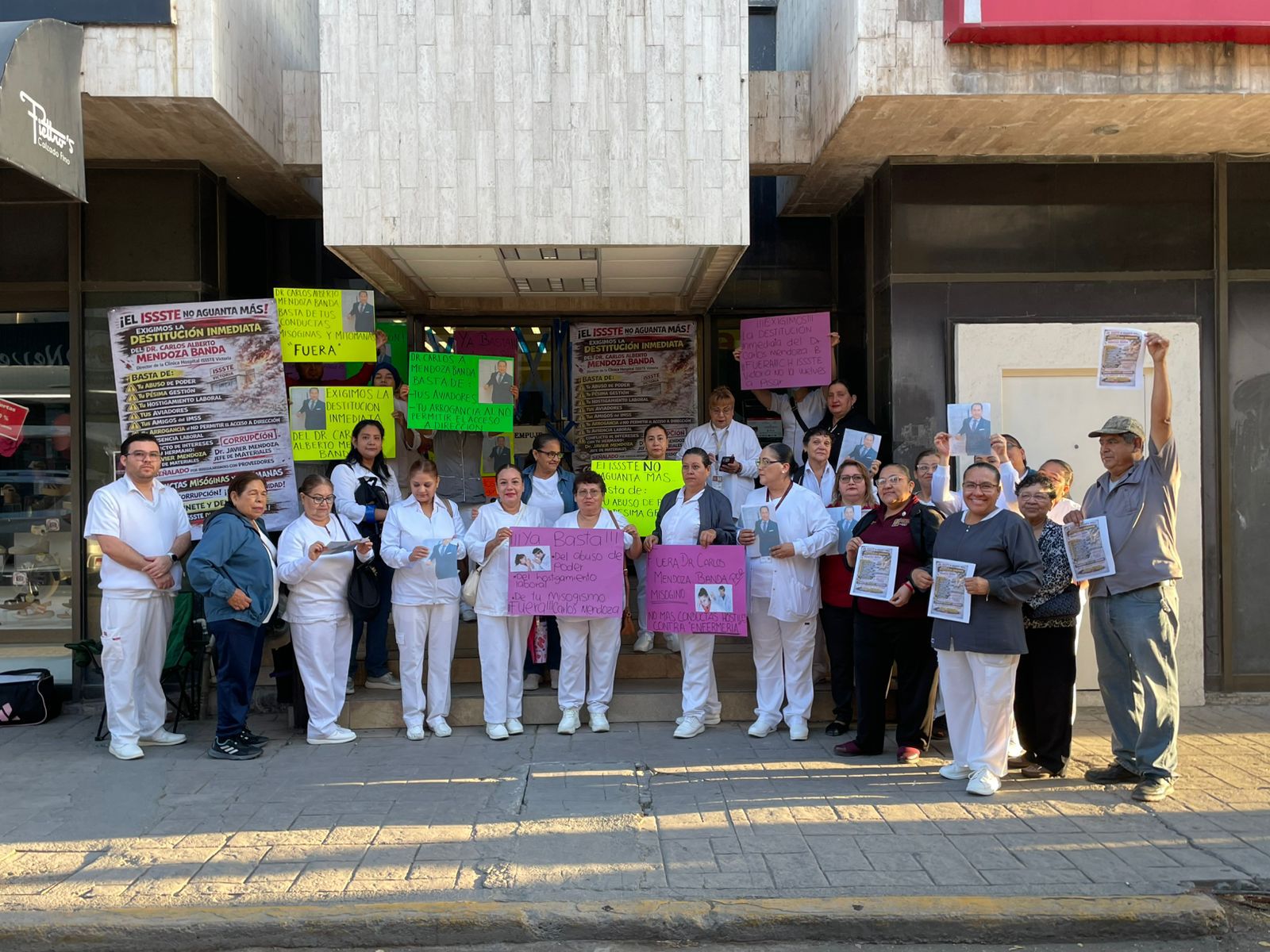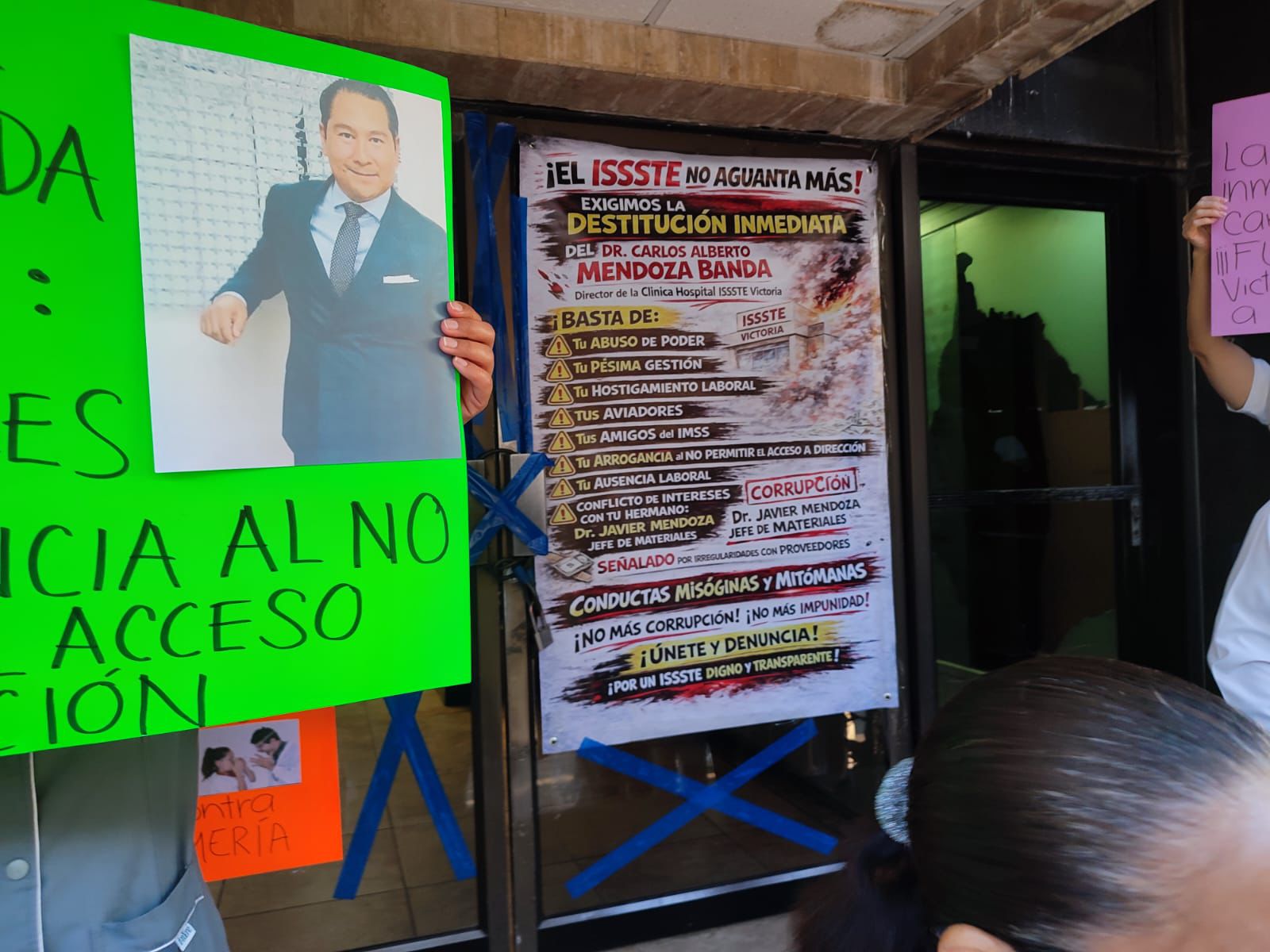 Ciudad Victoria, Tamaulipas (23 de marzo de 2026).- Un grupo de enfermeras de la clínica del ISSSTE cerró esta mañana las oficinas de la delegación ubicadas en el Nueve y Diez Hidalgo. La acción forma parte del séptimo día de manifestaciones para exigir la destitución del director de la unidad médica, Carlos Alberto Mendoza Banda.