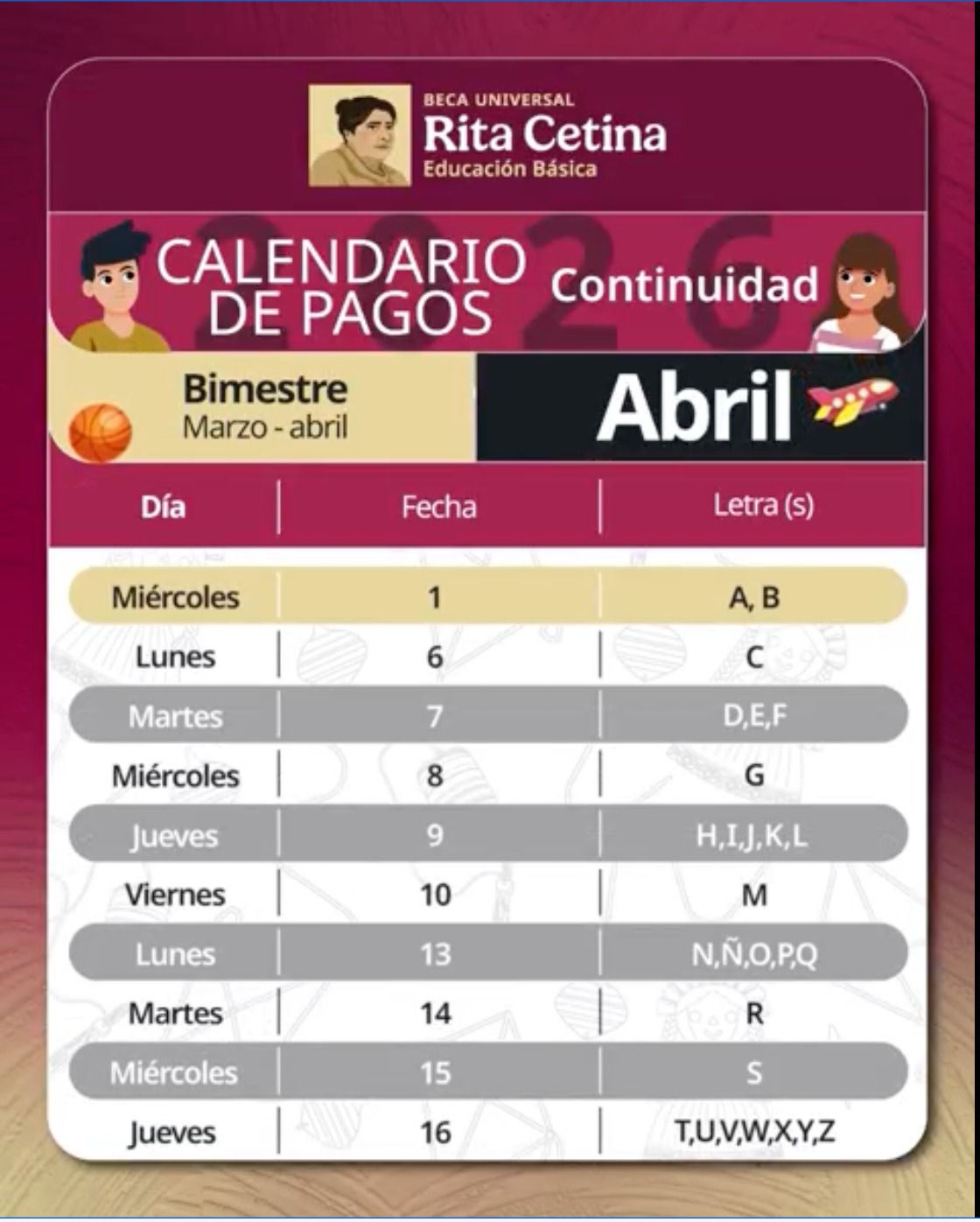 La dispersión de la Beca de Educación Básica “Rita Cetina” (Continuidad) iniciará el 1 de abril y concluirá el 16 del mismo mes. El recurso cubre el bimestre de marzo-abril.