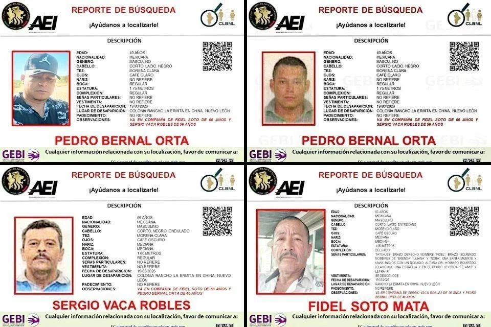 Monterrey, Nuevo León (25 de marzo de 2026).- La Fiscalía General de Justicia de Nuevo León informó sobre la desaparición de ocho personas en los municipios de China y General Terán. Según los reportes oficiales, las ausencias ocurrieron en eventos distintos durante los últimos días, lo que ha generado una movilización coordinada entre corporaciones de seguridad estatales y federales para localizar a los ciudadanos.